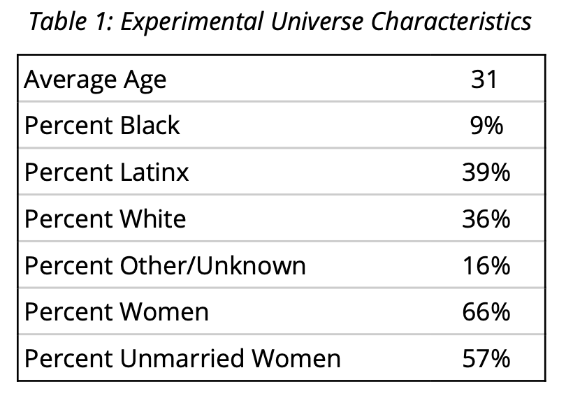 The universe for this test included 853,483 cell phone numbers of unregistered voters. The list was acquired from TargetSmart and was comprised of people of color under 40 as well as unmarried women under 35 in states with online voter registration. States included in the test were AL, AZ, CA, CO, CT, GA, IA, IL, IN, KS, KY, LA, MA, MD, MN, MO, NV, OR, PA, SC, UT, VA, and WA. The universe was limited to states with online registration in order to ease the workflow between receiving the voter registration text messages and filling out registration forms.