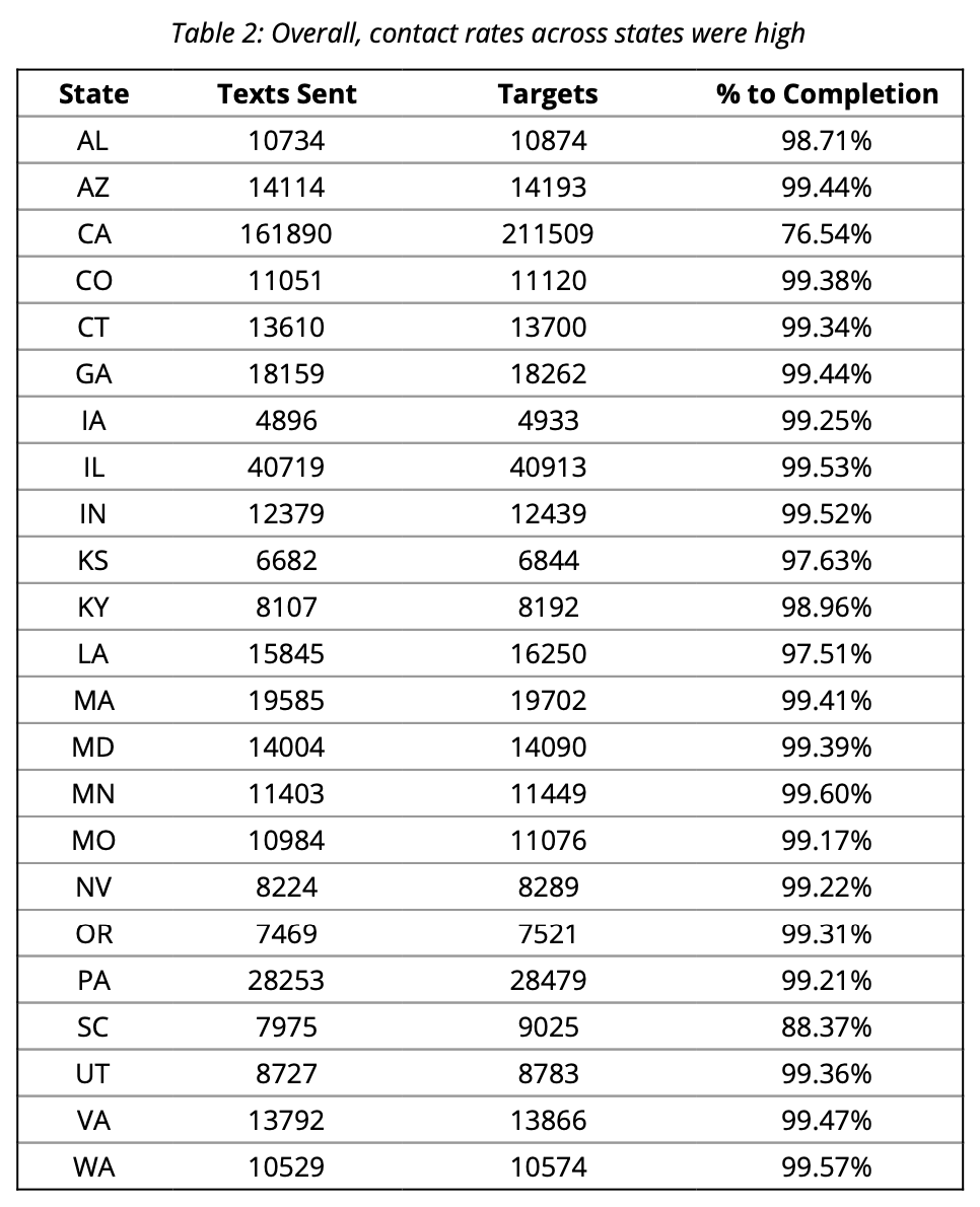 A total of 459,131 texts were sent to targets. The overall completion rate (i.e., the share of targets receiving texts) was 90%, with most targets receiving at least one text message. There was minimal variation in completion rates by state (Table 2). With the exception of CA and SC, between 97% and 100% of the treatment universe received at least one text.