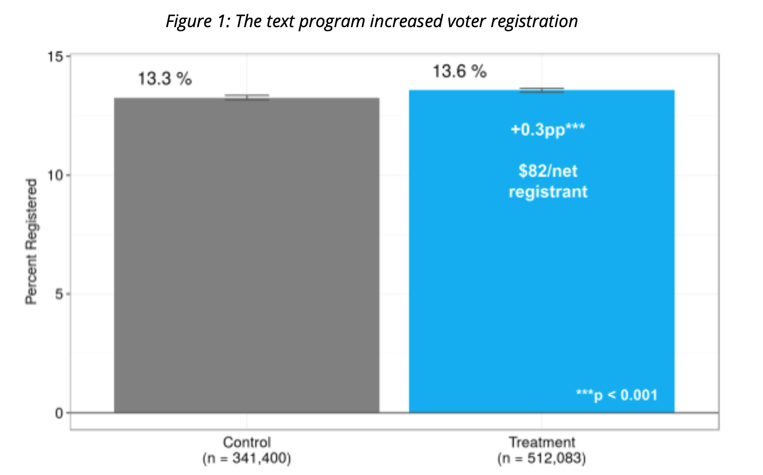 The text program had a positive influence on voter registration (Figure 1), increasing registration rates from 13.3% in the control condition to 13.6% in the treatment group. This 0.3 pp boost in registration rates is statistically statistically (p < 0.001). The program generated 1,601 net registrants at a cost per net registrant of $82 or 12 registrants per $1,000 spent.
