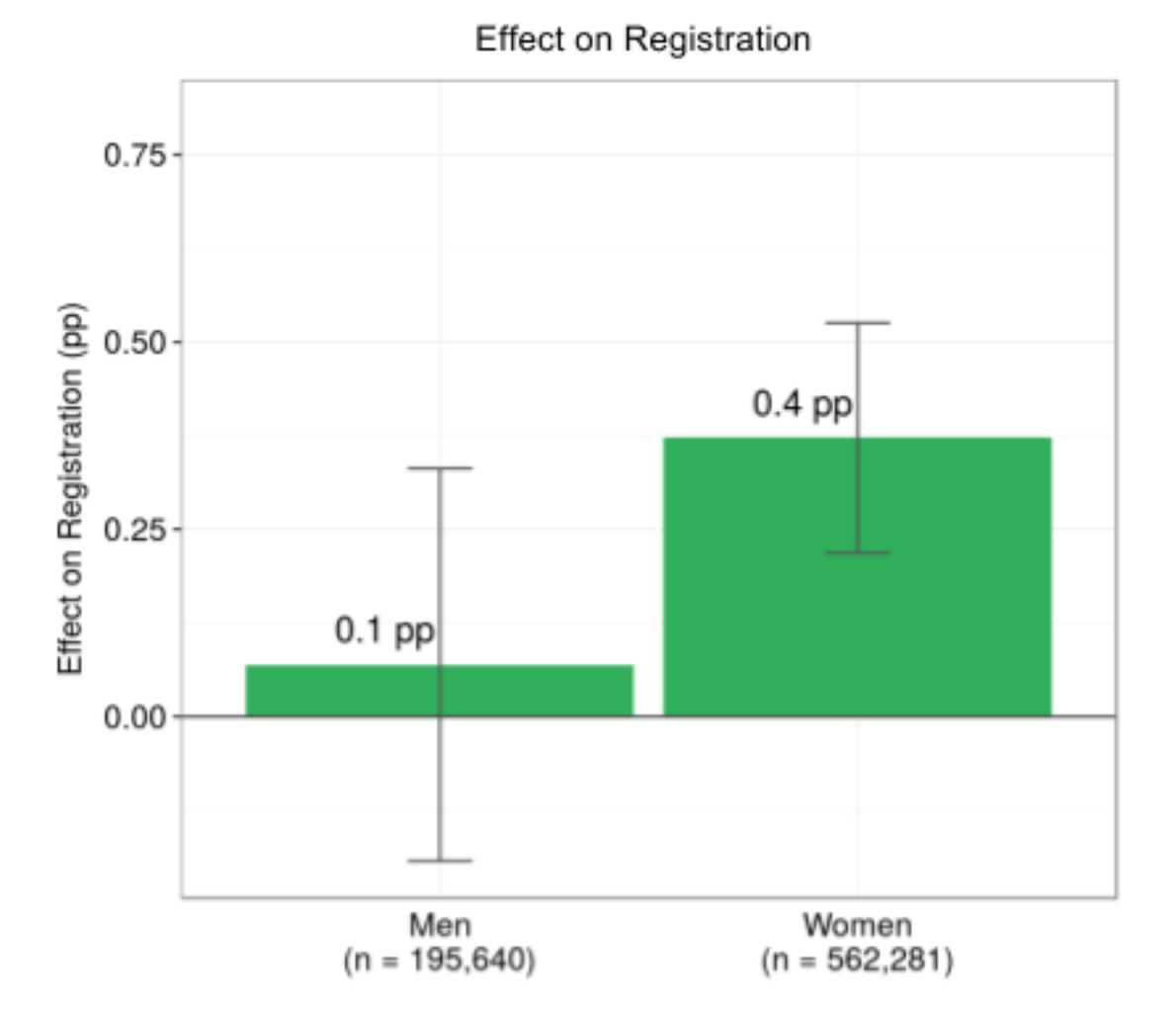 The effects of the text program on registration and turnout were examined by voters’ demographic traits, including age, race, gender and marital status, and by whether or not individuals lived in a battleground state. While effects did not appear to vary by age, race, marital status or registration in a battleground state, there was some evidence of heterogeneity in effects by gender, with women being more treatment responsive than men (Figure 3). The mechanism underlying this pattern is unclear, however. Further testing is needed to validate these gender differences before concluding that women are uniquely responsive to voter registration text programs.