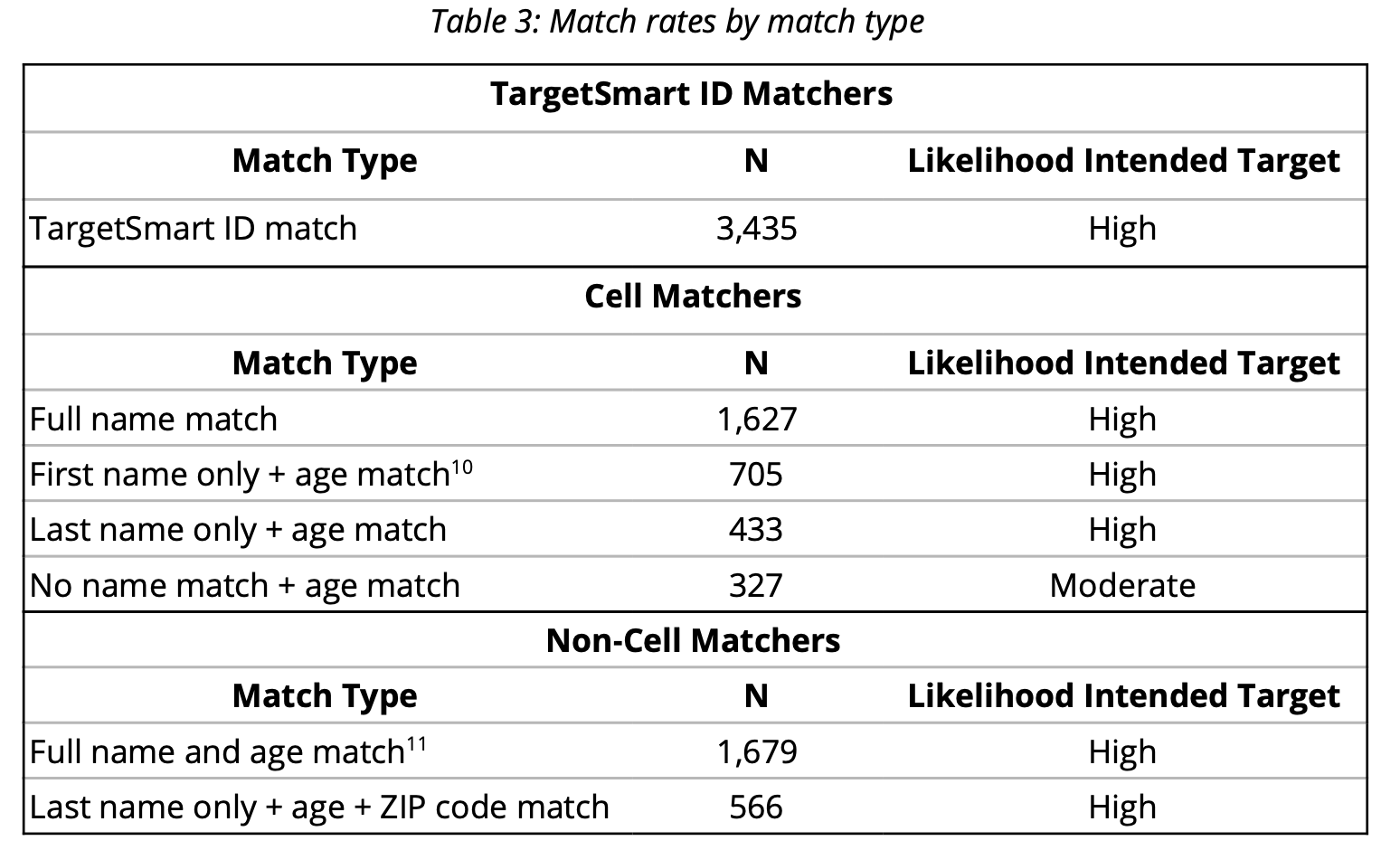 - Among those who could not be matched based on TargetSmart IDs, 8,018 people (34% of forms submitted) could be matched to form submissions based on phone numbers listed in the original target data and on forms submitted. 2,765 of these cell matchers (12% of forms submitted) had suffciently comparable name and age data across data sources to indicate a high likelihood that intended targets had been reached and submitted a form (Table 3). This increases to 3,092 (13% of forms submitted) if matches indicating a moderate likelihood that intended targets had been reached are included.
