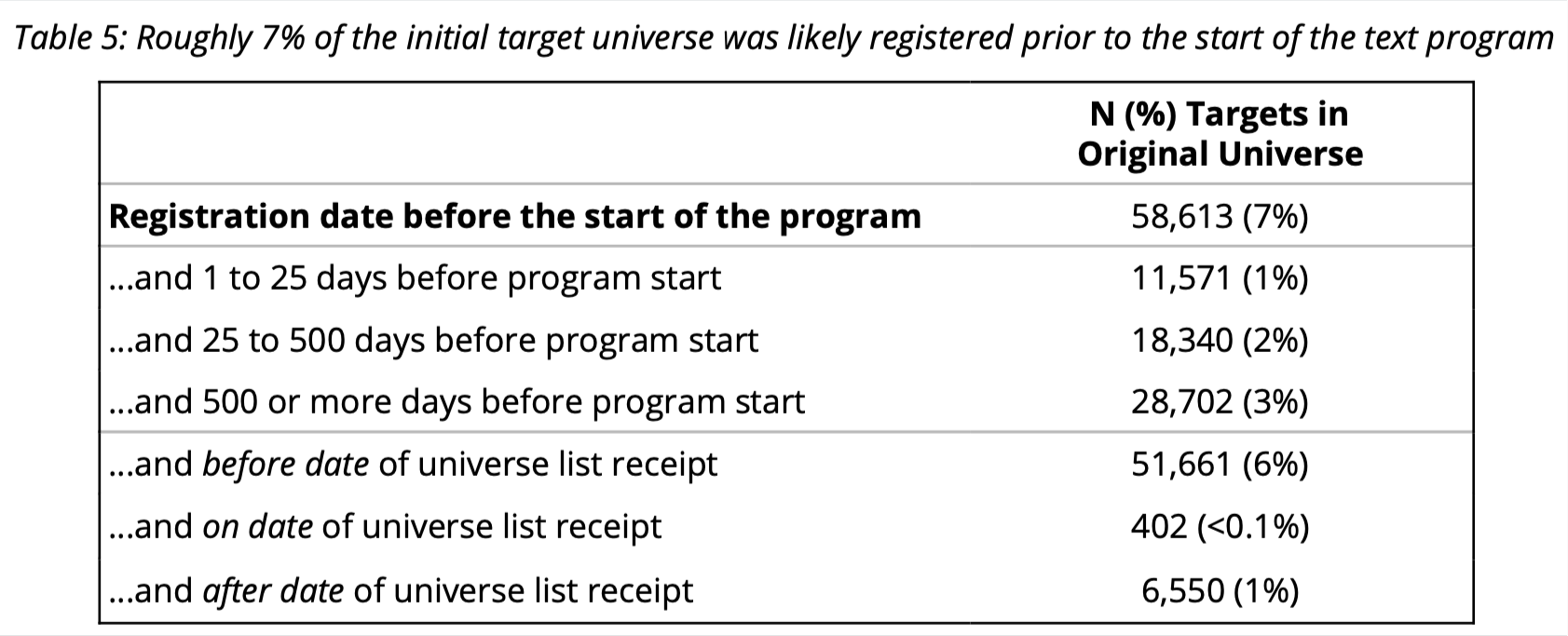 Table 5: Roughly 7% of the initial target universe was likely registered prior to the start of the text program
