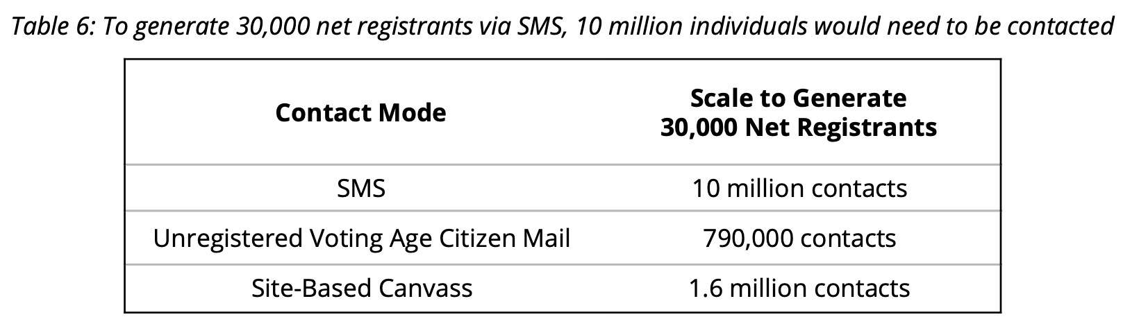 Table 6: To generate 30,000 net registrants via SMS, 10 million individuals would need to be contacted