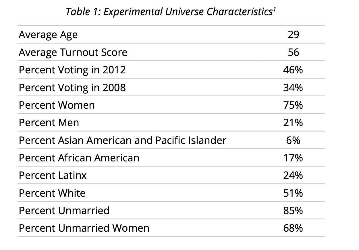 The experimental universe included 1,207,316 registered voters with cell phone numbers on the TargetSmart voter file. Targets were people of color under 40 and unmarried women under 35 residing in AZ, MO, NV, OH, PA, UT, and WI.