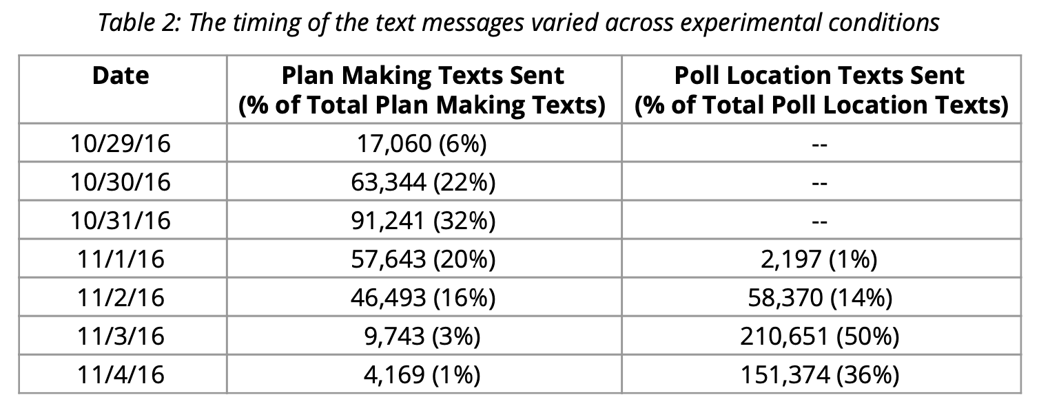 Text messages were delivered in the last two weeks leading up to the November election. The timing of the text messages varied across the experimental conditions, with plan-making texts being delivered on 10/29 through 11/4 and polling location texts being delivered on 11/1 through 11/4. Most plan-making texts were sent one week or more before Election Day while most polling location texts were sent on Thursday 11/3 and Friday 11/4 before Election Day.