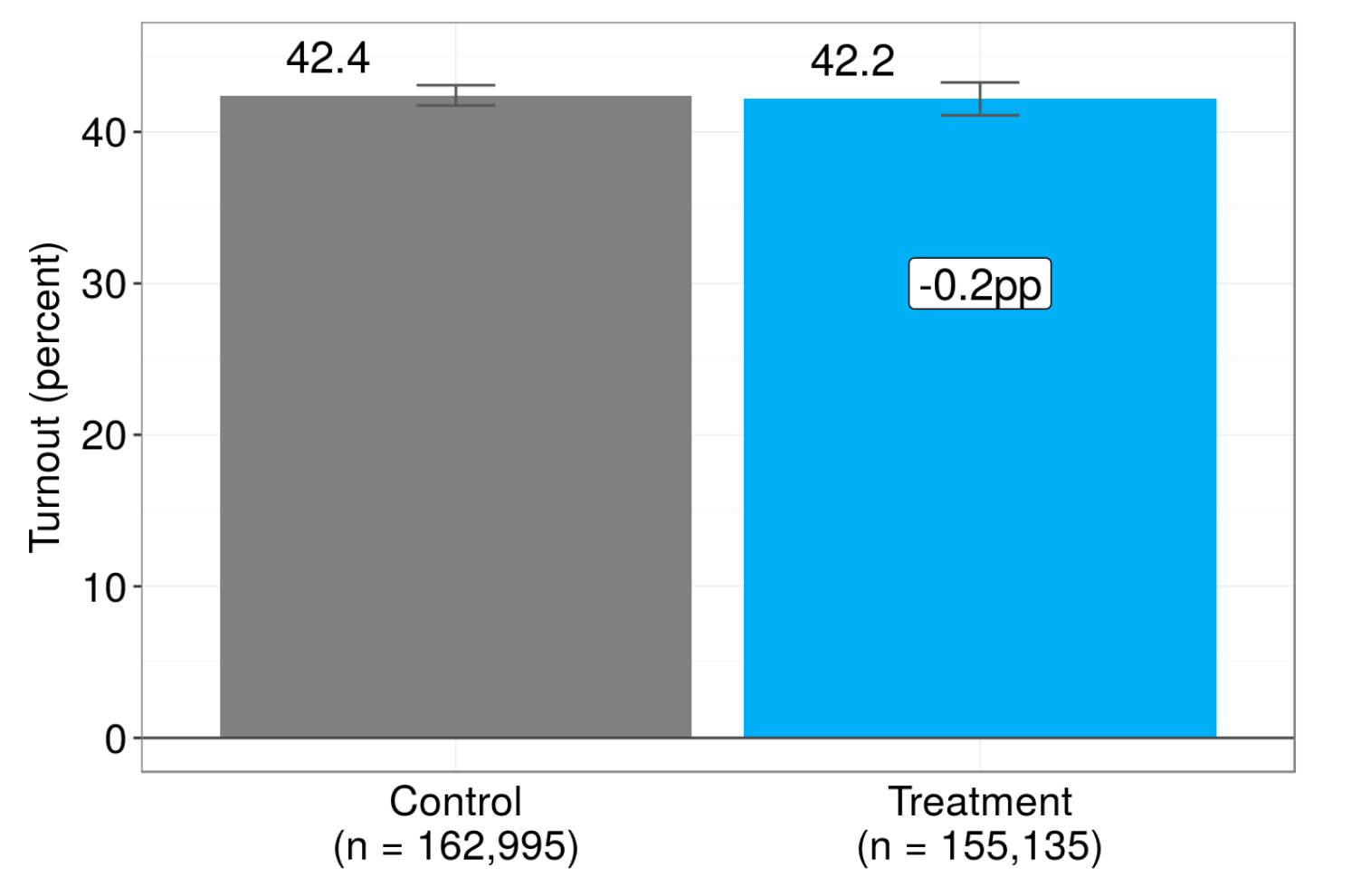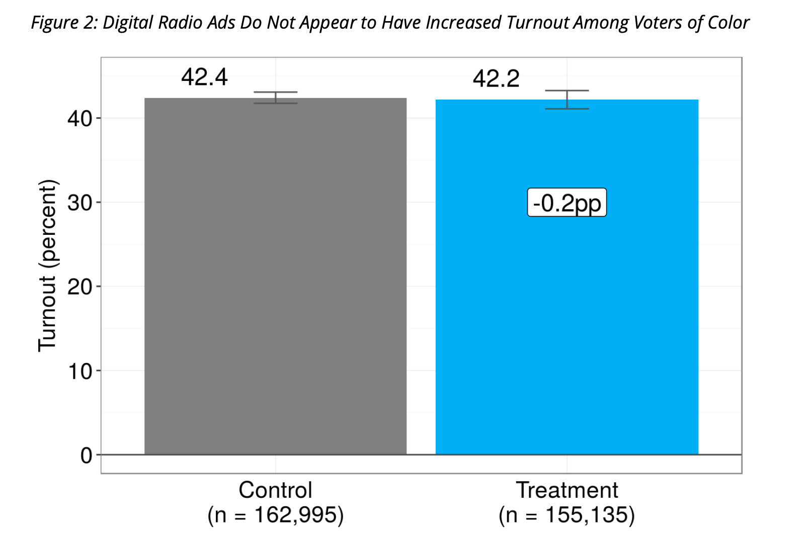 Overall, Pandora and Spotify ads promoting voting do not appear to have increased turnout among voters of color in the Tidewater region. The baseline rate of voting in control was 42.4%; turnout among modeled Black, Latinx, and Asian-American voters in treatment ZIP codes was a statistically insignificant 0.2pp (p = 0.76) lower than in control ZIP codes (Figure 2).