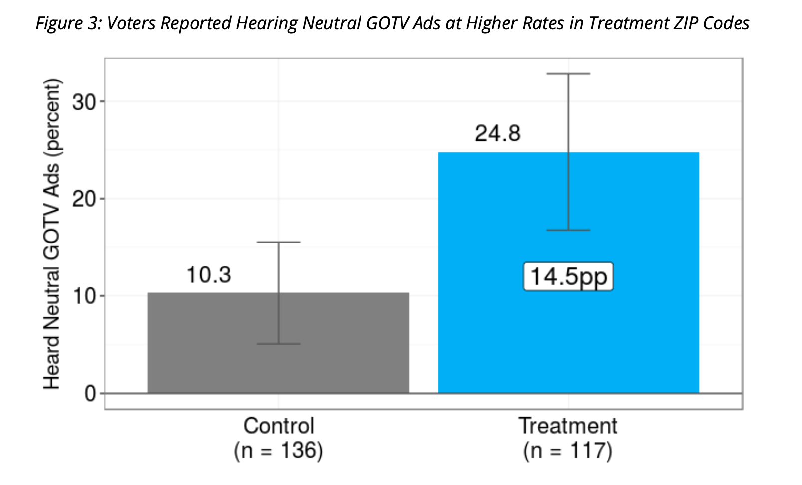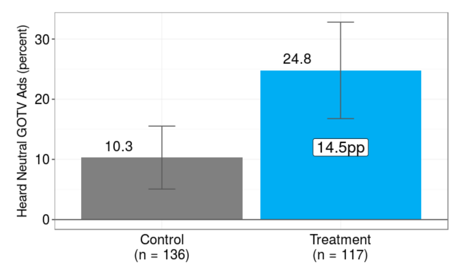 - A separate survey of 253 voters in the same experimental ZIP codes indicates that more people in treatment ZIP codes reported hearing neutral GOTV messages (which favored no party or candidate) on digital radio than in control ZIP codes. 25 percent of voters in treatment ZIP codes, versus 10 percent in control ZIP codes (15pp difference, p < 0.01), reported hearing neutral GOTV digital radio ads.Key takeaways: