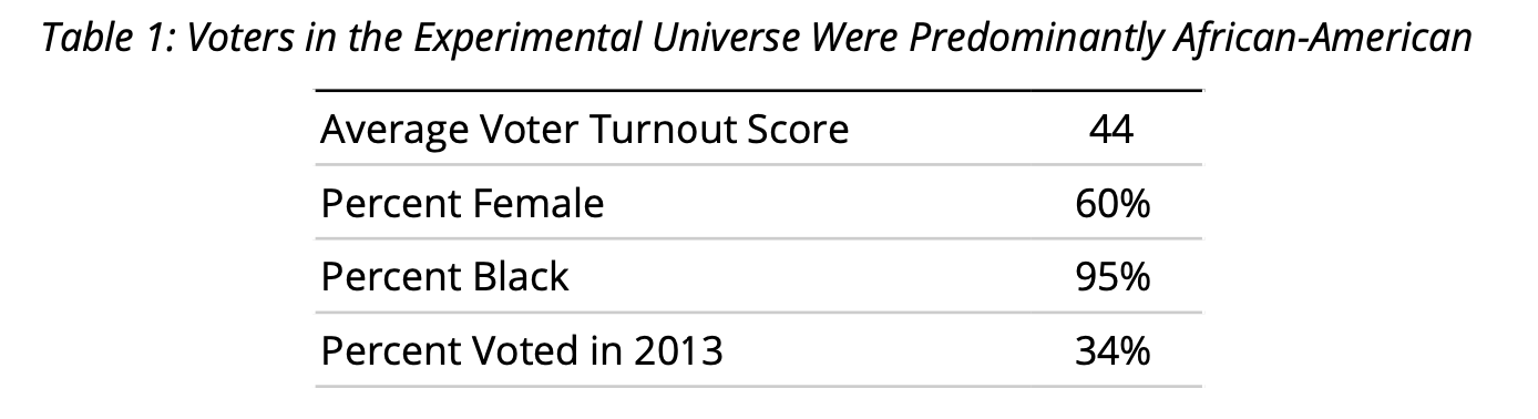 The experimental universe consisted of 318,130 modeled voters of color in 183 experimental ZIP codes in the Tidewater region of Virginia. The randomization occurred at the level of the ZIP code, but the analysis was conducted at the individual level among registered voters in the experimental ZIP codes. Table 1 shows the characteristics of the experimental universe.