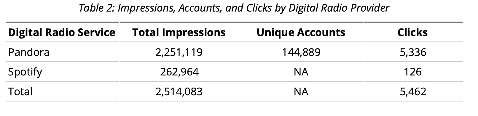 Table 2 summarizes the number of impressions, unique listener accounts (only available for Pandora), and clicks for each digital radio service. Taken together, the ads had over 2.5 million impressions, and probably reached approximately 160,000 listeners in the target ZIP codes.2 While this number is slightly larger than the number of targets in our test, it is critical to note that we cannot know for certain what proportion of these listeners were, in fact, people of color or registered voters in the targeted ZIP codes based on the implementation data. We only know that people of color in the treatment ZIP codes were targeted by the ads; we do not know which individuals actually were served ads. It appears that the ads resulted in very few clicks, though given that many people listen to digital radio in the background, it may not be realistic to expect many click-throughs.