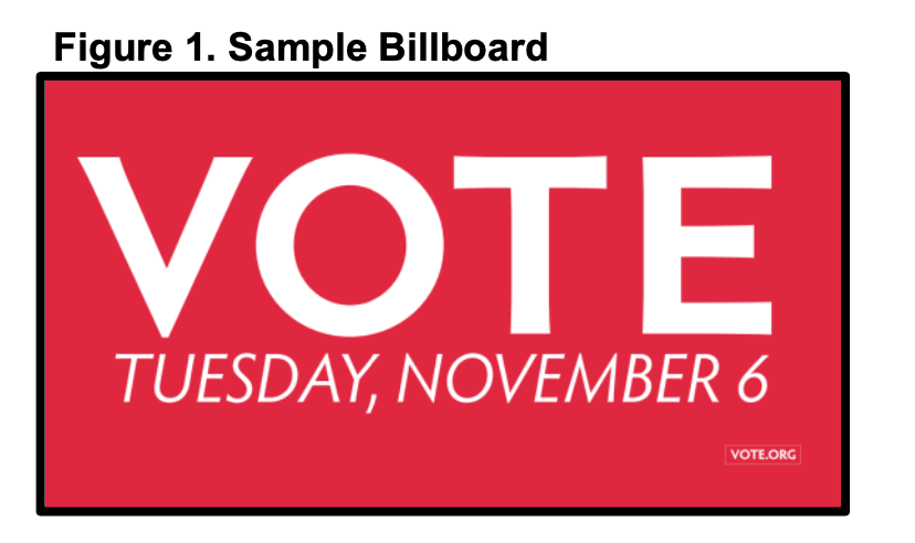 For the 2018 midterm elections, NCO purchased thousands of billboards across 10 regions aimed at increasing voter turnout by providing people with a reminder about Election Day. The billboards were non- partisan and contained a reminder to vote, the election date, and small organization logo (see Figure 1).