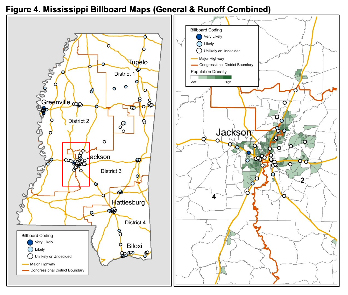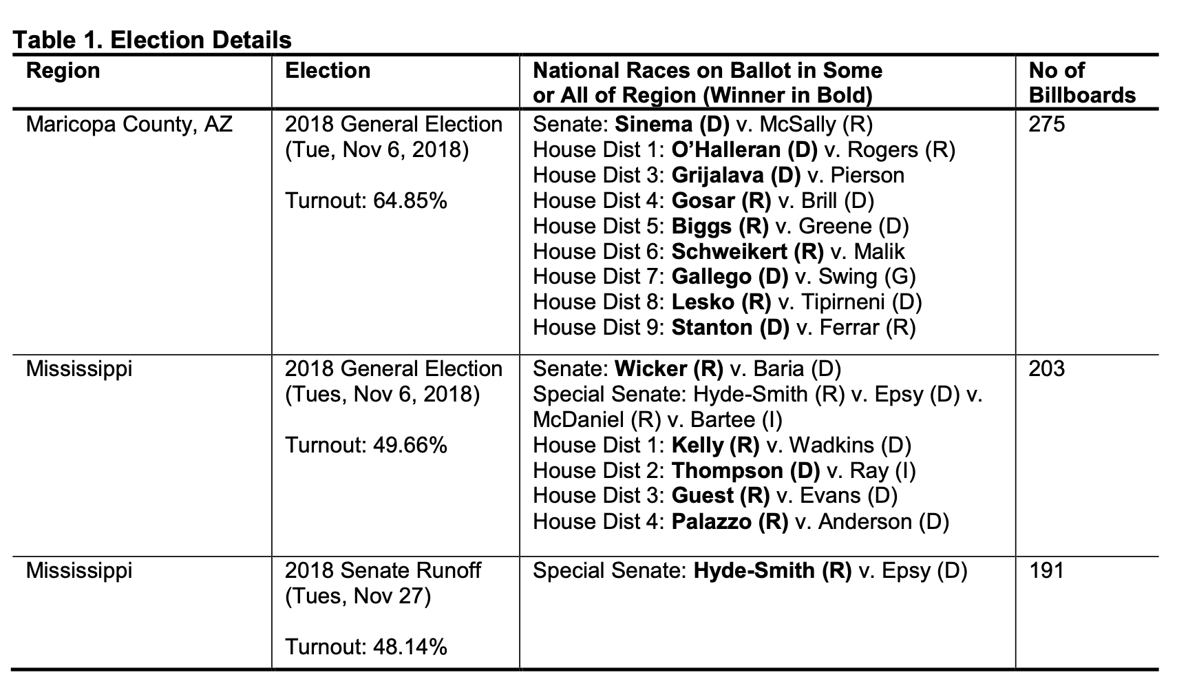 This report focuses on the billboard purchases in three elections across two regions: (1) the 2018 general election in Maricopa County, AZ where the election of note was Arizona’s U.S. Senate seat and (2) the 2018 general and runoff elections in Mississippi where the elections of note were two simultaneously open U.S. Senate seats. (See Table 1 for more details on the elections.)