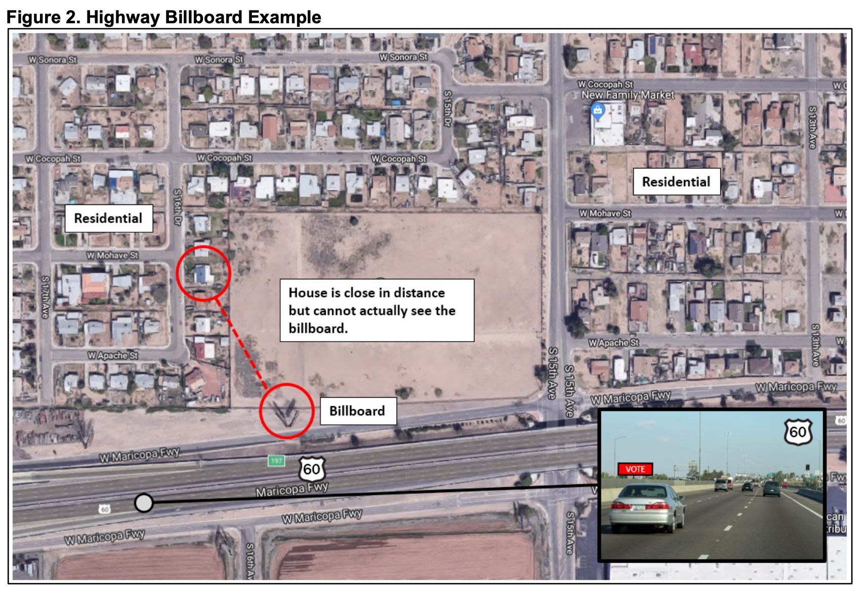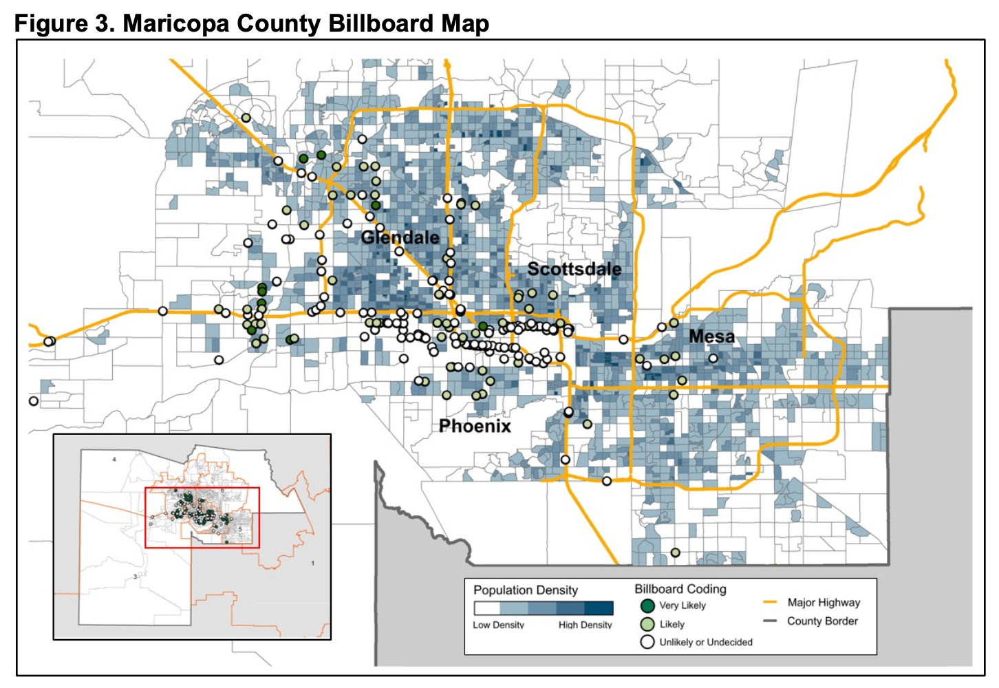 This distance-based proxy for exposure presents some problems. A considerable portion of the billboards purchased by NCO are along highways that route through more urban and suburban areas. Those living near these highway billboards (by road or as-the-crow-flies) may not actually be the people who are regularly exposed to it. Consider the image in Figure 2 below, which shows one of NCO’s Maricopa County billboard purchases. The billboard is located along West Maricopa Freeway but is primarily viewed from Route 60 (see inset). There are a considerable number of homes in this Central City South neighborhood that are spatially proximate to the billboard but the people who live in these homes are not the people most likely to see it. Indeed, the people who live closest to this billboard would need to travel to the closest highway exit and head in the direction of the billboard to see it. Meanwhile, people traveling from farther away may pass it every day on their commute. Previous research does not appear to have accounted for this challenge when using distance as a proxy for exposure.