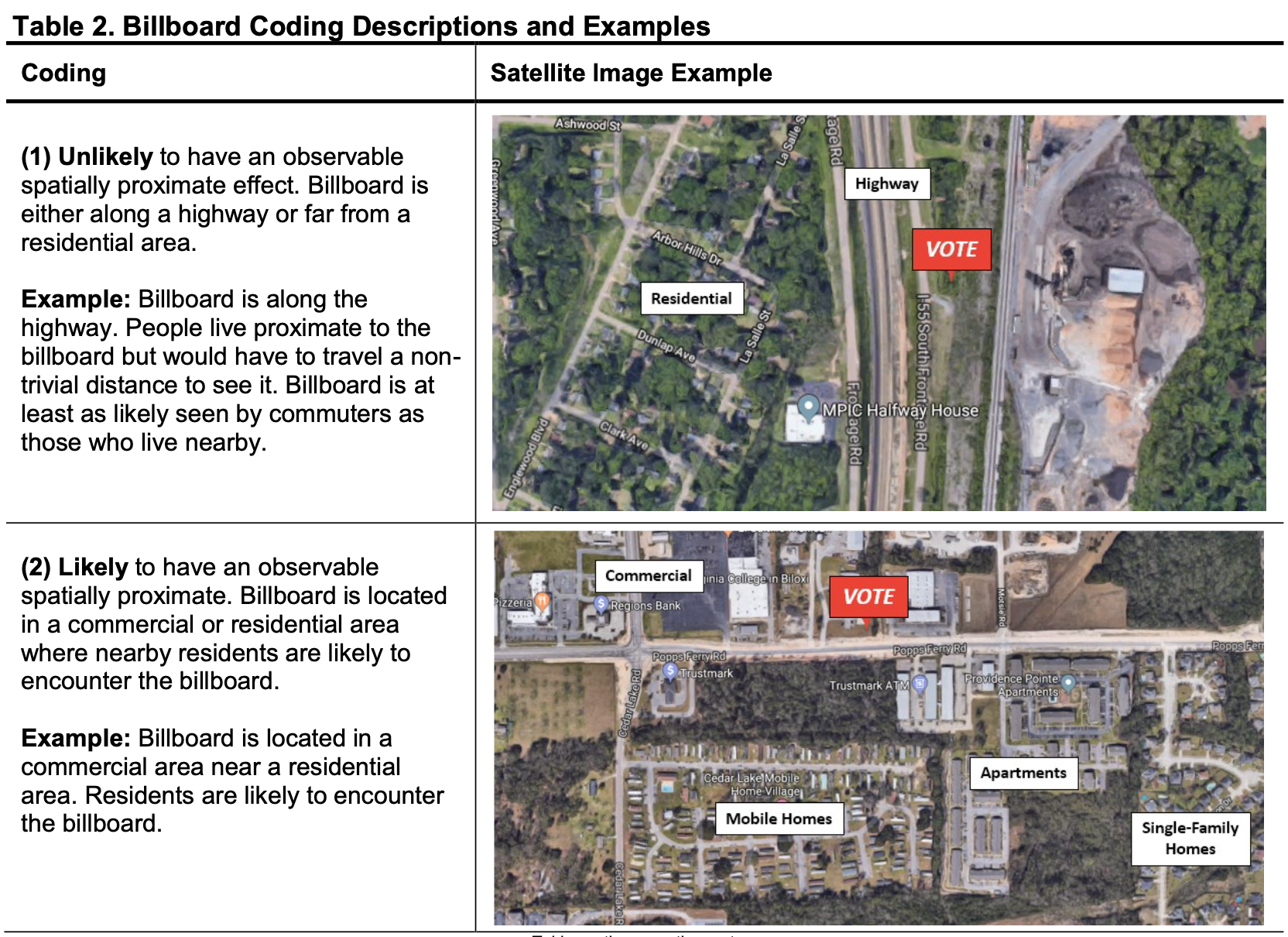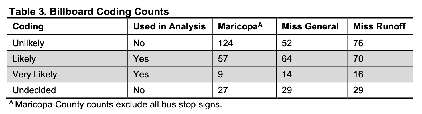 Central to this idea of a spatially proximate observable effect is that not all billboard locations should be treated the same. Thus, billboards needed to be broken down into those that were likely to have a spatially proximate observable effect and those that were not.4 Using pictures of the billboards from AdQuick and satellite images of each billboard location, I coded each billboard as (1) unlikely, (2) likely, or (3) very likely to have an spatially proximate observable effect. (A fourth category included those billboards for which a determination could not be made.) Purchases in Maricopa County also included 26 bus stop signs that were all coded as “unlikely”. Table 2 explains the coding scheme and provides examples. This coding process resulted in a substantial reduction in usable billboards while still leaving plenty to complete the analysis with (Table 3).