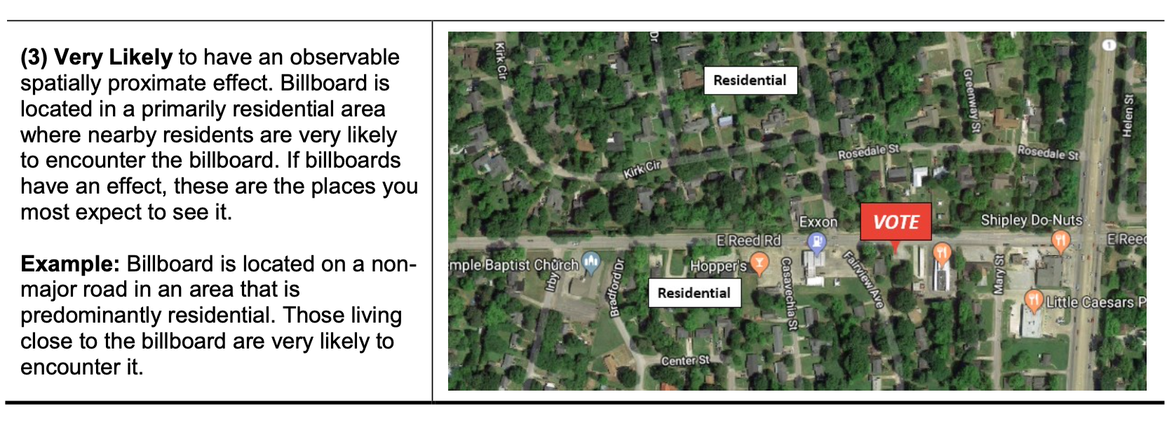 Because distance is proxying for likelihood of treatment, the distinction between “effect” and “observable effect” is important. Any person that passes by a billboard may be reminded of when election day is and, as a result, vote (or not vote) – this would be an effect. However, absent the ability to track every person’s actual exposure, we are forced to look for what I will refer to as a spatially proximate observable effect. For this analysis that means identifying increased turnout near appropriate billboards. Highway billboards are not likely to have a spatially proximate observable effect for the reasons outlined above. A spatially proximate observable effect is more reasonable if the billboard is situated in a place where the people who live close to the billboard are also the people who are most likely to see it. These billboards tend to be the ones in commercial areas that have adjacent residential areas.