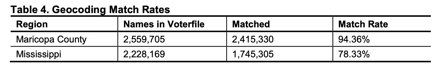 To test the effect of the billboards I developed a Geographic Information System (GIS) and individual- level dataset for each of the three elections. Registered voters in both regions were geocoded using Catalist voterfile data and the Census Bureau’s Address Locator files. Match rates (the percent of registered voters that could be successfully geocoded) appear in Table 4 below. These match rates are high (the Maricopa rate is very high) and Zip Code analyses suggests that the unmatched addresses were mostly located in more rural areas where address data tend to be less accurate. These are also areas were NCO tended not to have billboards.