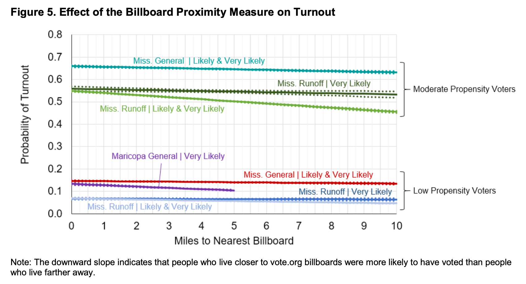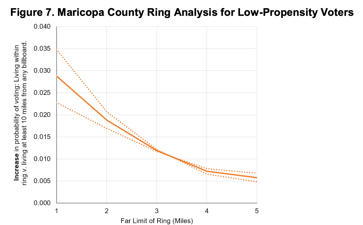 - The exception is that low-propensity voters in Maricopa County who lived close to a billboard I coded as “very likely” to have a spatially proximate observable effect, were slightly more likely to have voted than a low-propensity voter who lived farther away.
