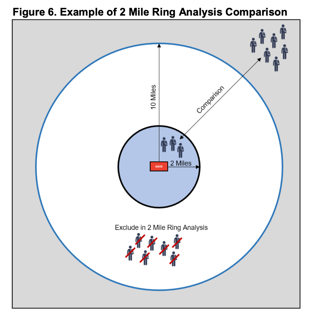 NCO’s billboard purchases were not made randomly. In purchasing billboards, NCO was constrained by budget and AdQuick’s availability, and then prioritized the selection of billboards in minority and lower-turnout areas. Even without those constraints there is no reason to believe that billboards are randomly distributed across the regions being analyzed – which would be ideal for analysis. While complete datasets are available for both Maricopa County and Mississippi and some controls for the non-random placement of billboards could be instituted, my primary approach is to constrain the analysis to areas around the billboards that NCO purchased. As such, I constrain the datasets to all registered voters living 5 miles from a billboard in Maricopa County and 10 miles from a billboard in Mississippi. The difference in radii is due to Maricopa County having a significantly higher population density than the state of Mississippi. This analysis compares people that live close to a NCO billboard with those that live farther from a NCO billboard, but still within the given radius. I also use a ring analysis that expands the pool of examined voters beyond the radial thresholds to further empirically validate the results – this is discussed in more detail below.