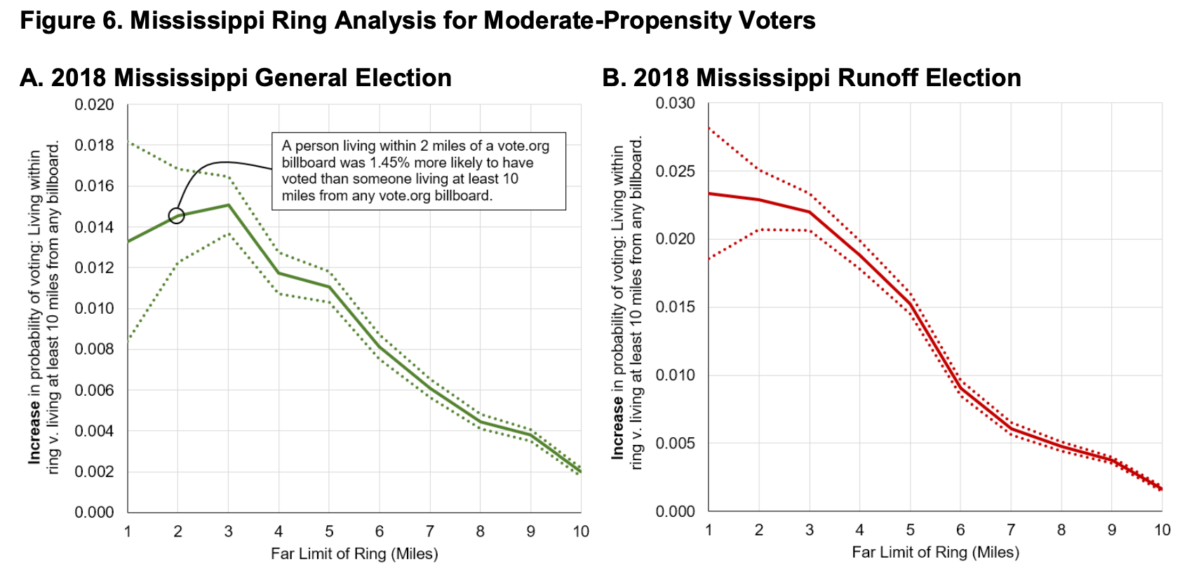 This analysis of Mississippi and Maricopa County suggests that NCO’s billboard program is worth continuing if NCO is satisfied with the potential turnout gains. Given the challenges of getting people to open letters and read emails, billboards offer a GOTV strategy with high potential to actually reach the people that drive near them. Continuation is also justified by the evidence that billboards may boost turnout among historically difficult to reach low-propensity voters.