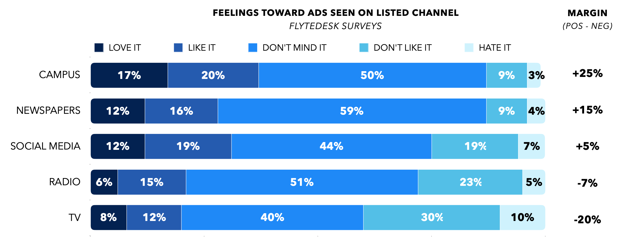 In the Flytedesk surveys, students were most positive about political advertising on or around campus, with 37% of students reporting they liked or loved it. Channels where students felt more negative about ads included the big three - social media, radio and television - with more than one-quarter reporting they did not like or hated political ads on them.