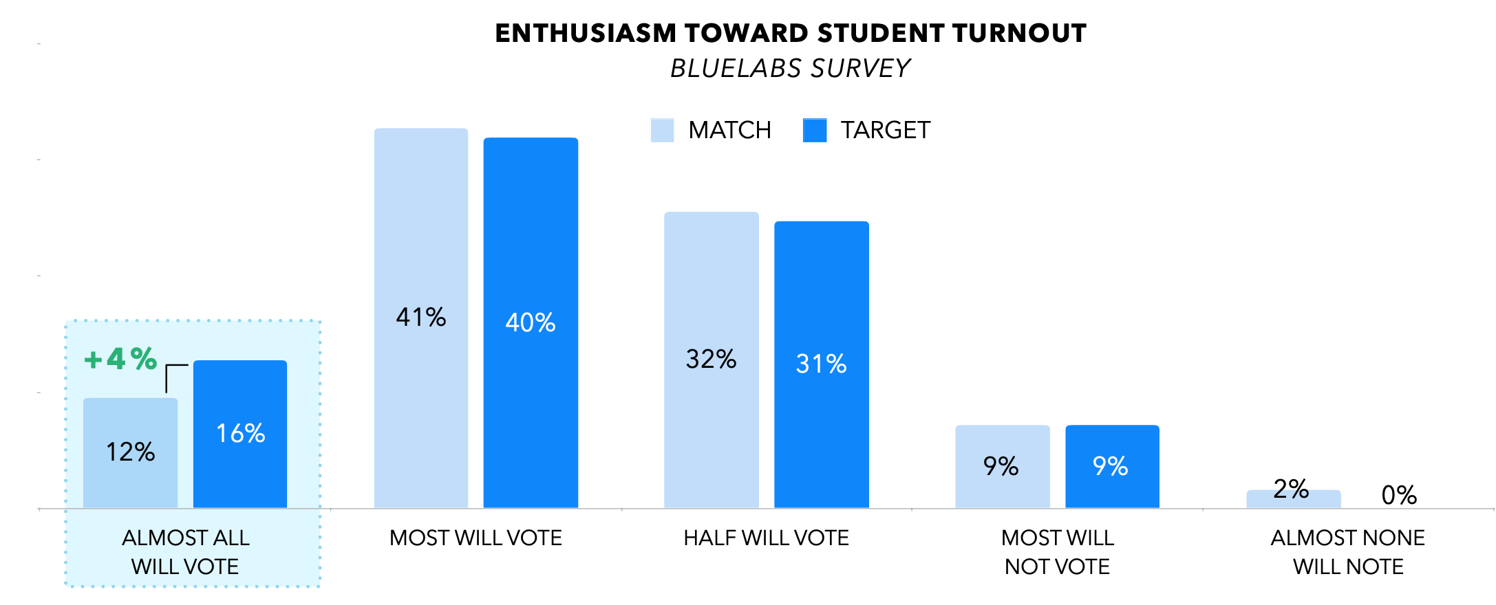 Voter file analysis indicated that the change in turnout rate was 2 percentage points higher for target campuses compared to match campuses. In addition to available findings from the voter file, we saw a similar trend among respondents from the BlueLabs survey. Respondents from target campuses were 3% more likely to turn out and vote compared to respondents from match campuses.