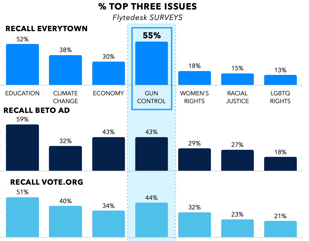 Notably, students who recalled seeing an Everytown for Gun Safety ad were also more likely to report gun control as one of their top issues compared to those who recalled other ads (Beto or Vote.org). In fact, gun control was the most frequent response among Everytown recall-ers compared to the other issues, with more than half (55%) reporting it as being in their top three issues.