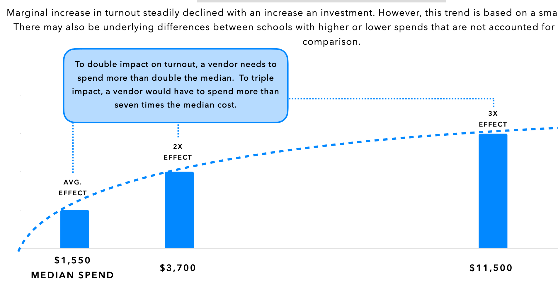Impact on turnout appears to increase with greater spending up to the highest amounts spent by Flytedesk in 2018, though marginal return on investment declines steadily as spending increases.