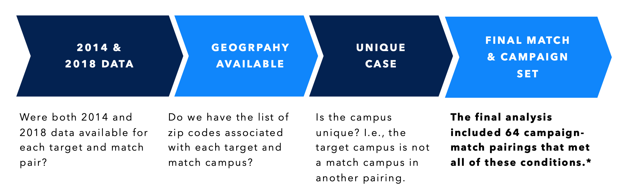The checklist below illustrates our checks to create the final set of campuses. *Note that zips overlapped between target and match campuses for roughly 1% of the final universe.