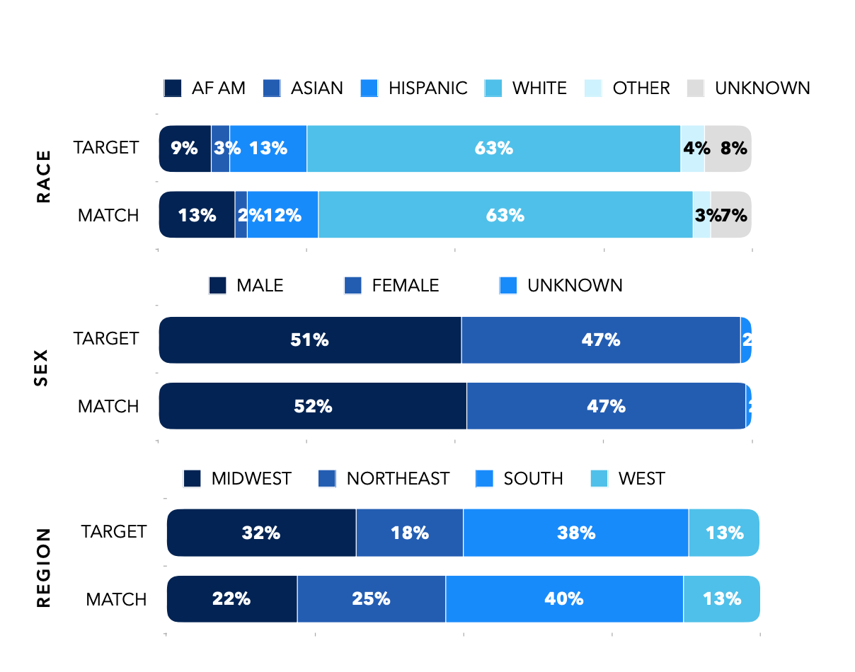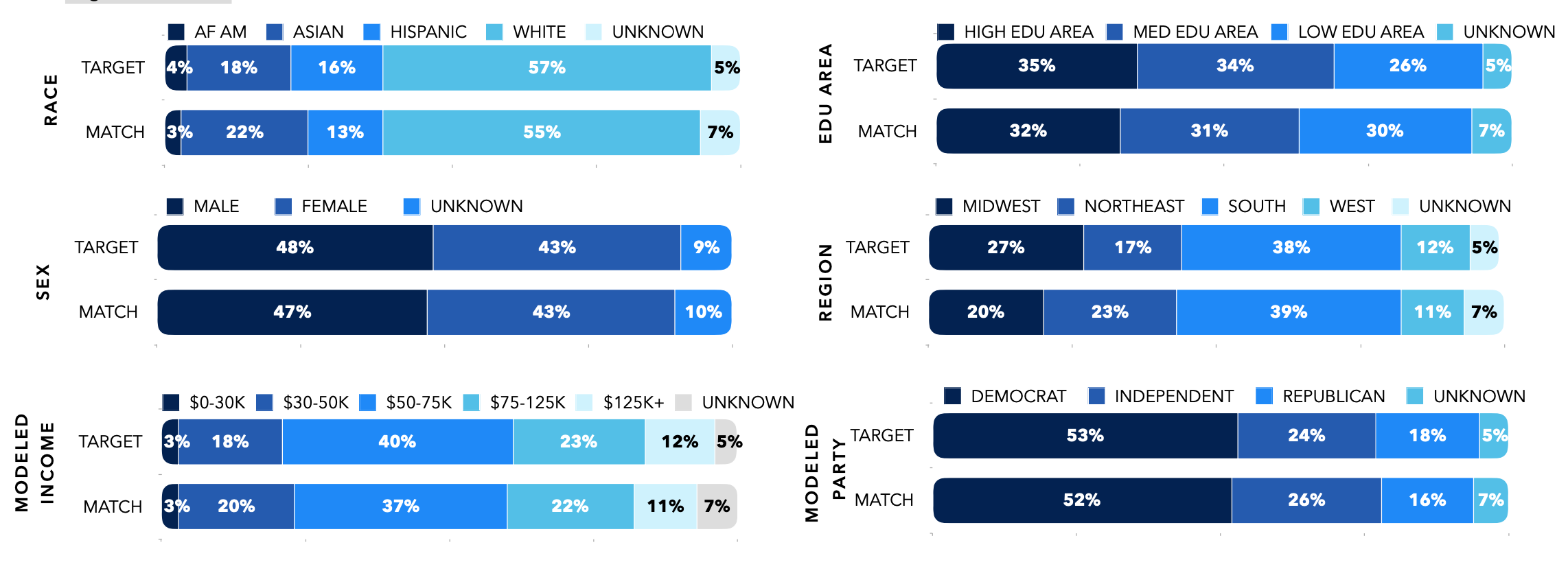 Prior to conducting analysis, we checked the demographic breakdowns for the final list of target and match campuses to confirm comparability to one another. Among registered voters, most of the general demographics were consistent, though regions varied: