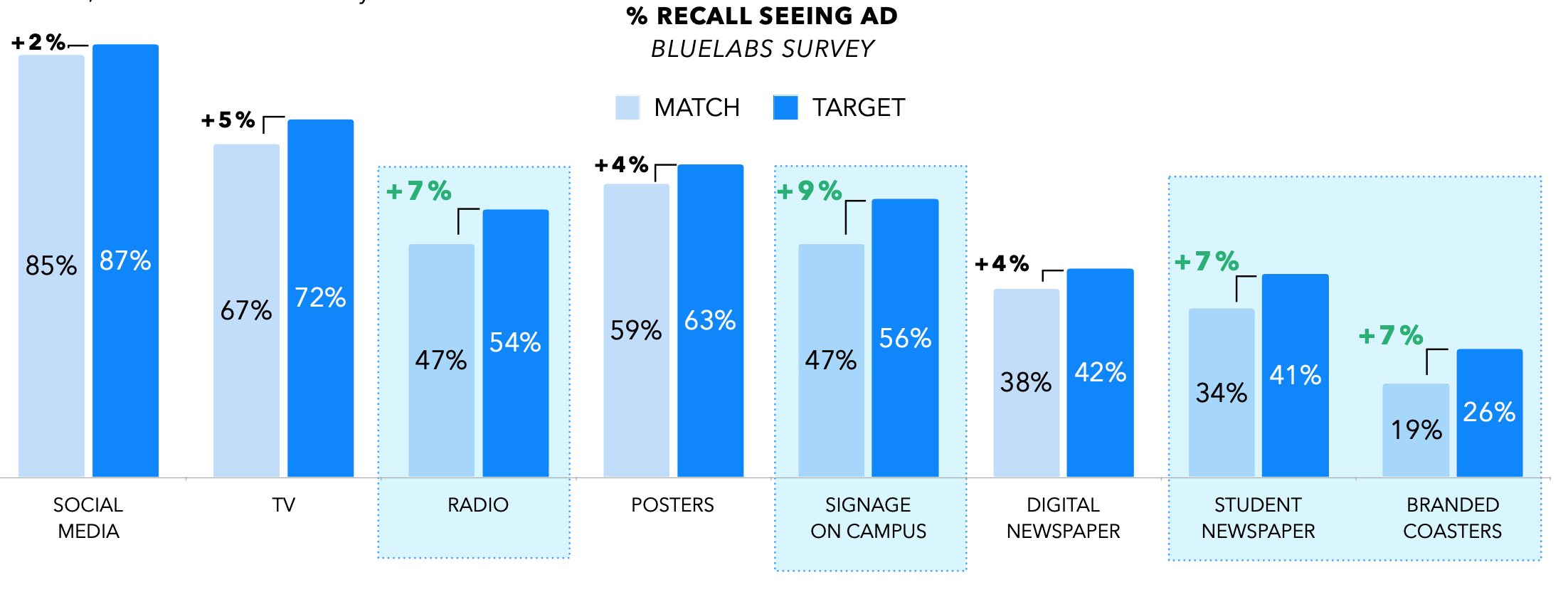 Compared to the traditional media channels used by other media vendors, Flytedesk-specific channels, such as signage on campus, student newspapers, and branded coasters, had the highest lift in ad recall when comparing target and match campuses. Radio, another media channel used by Flytedesk, also saw a higher lift of 7%, but since it is used heavily by other political media vendors, it’s harder to isolate Flytedesk’s effect.