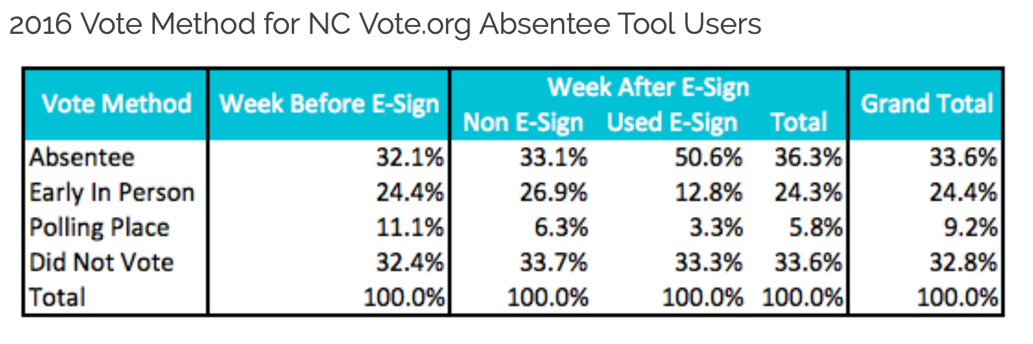 NCO had previously implemented E-Sign for absentee signup forms in 2016 in a few states. Following the 2016 election, Pantheon Analytics examined the results of the program. Pantheon evaluated the effects of E-Sign on turnout and vote method by focusing on those voters who used NCO’s absentee page just before and just after E-Sign’s debut. In at least some states, there were indications that E-Sign succeeded in getting more users to successfully convert to absentee status. In North Carolina, for instance, absentee voting was higher among people who used NCO’s tool in the week after E-Sign’s debut than among the previous week’s users – and much higher among those who actually did choose E-Sign, versus the printable PDF.