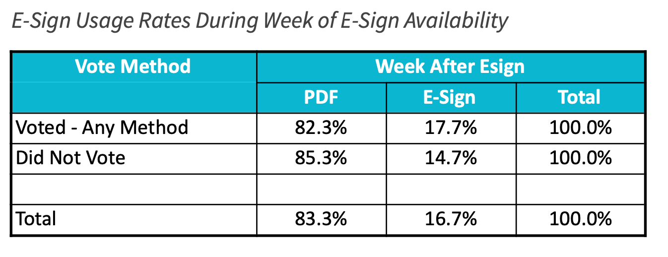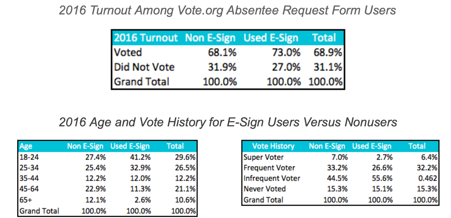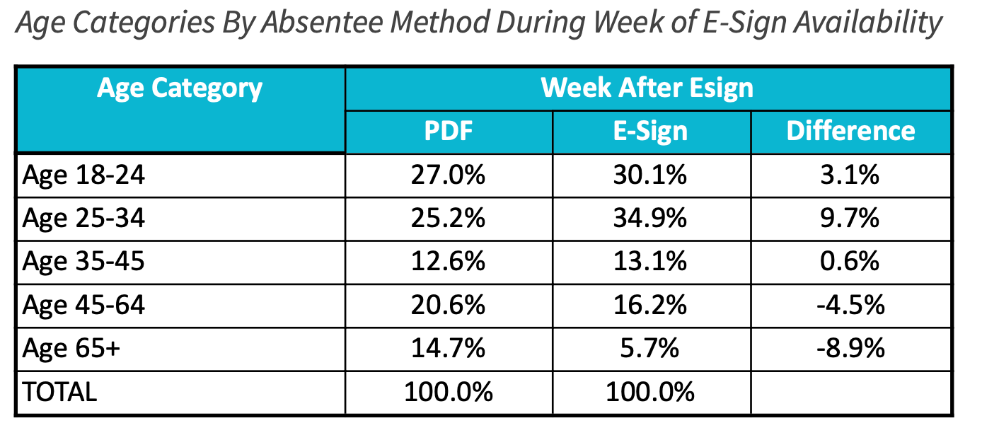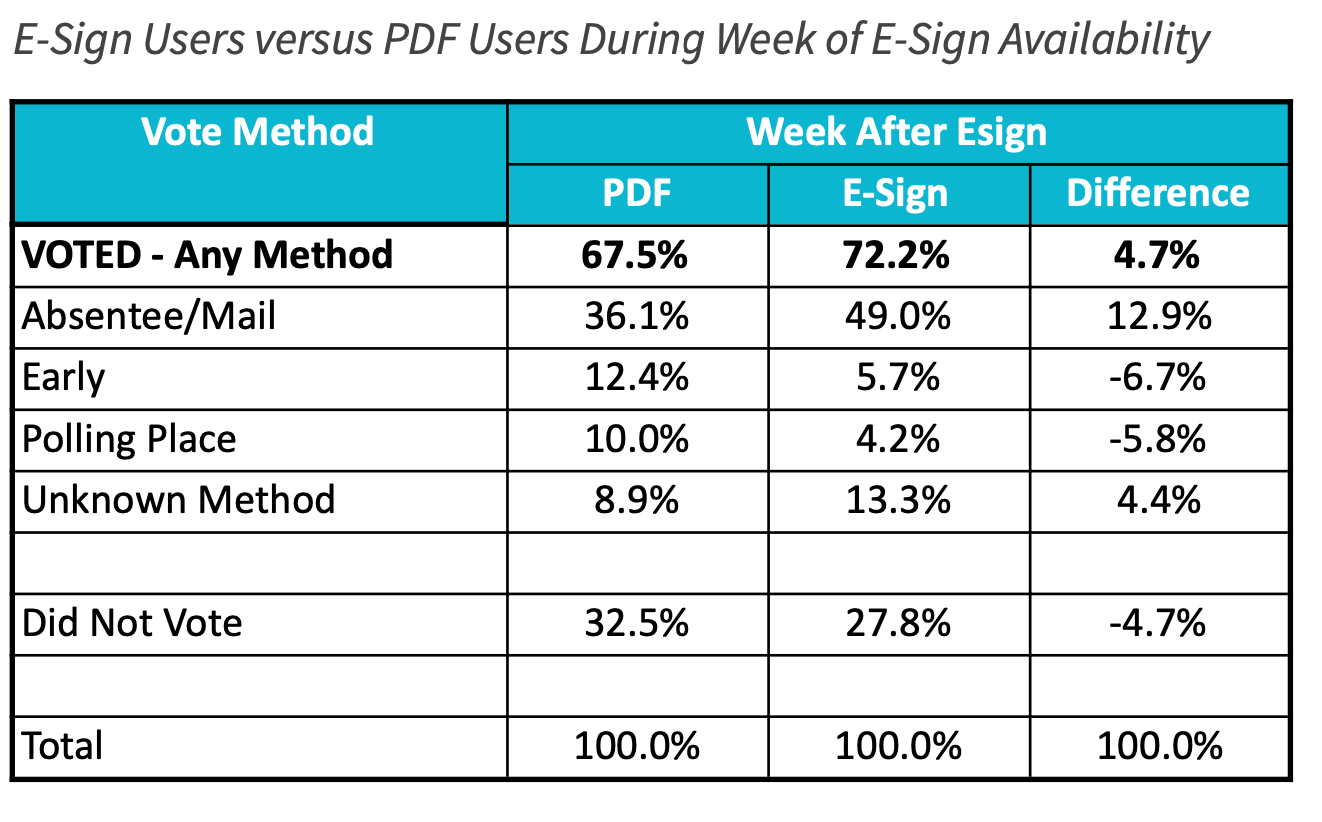 Additionally, the 2016 analysis found that overall turnout was higher among those who chose E-Sign versus those chose the printable PDF, despite the fact that E-Sign users were more likely to be young and/or infrequent voters.