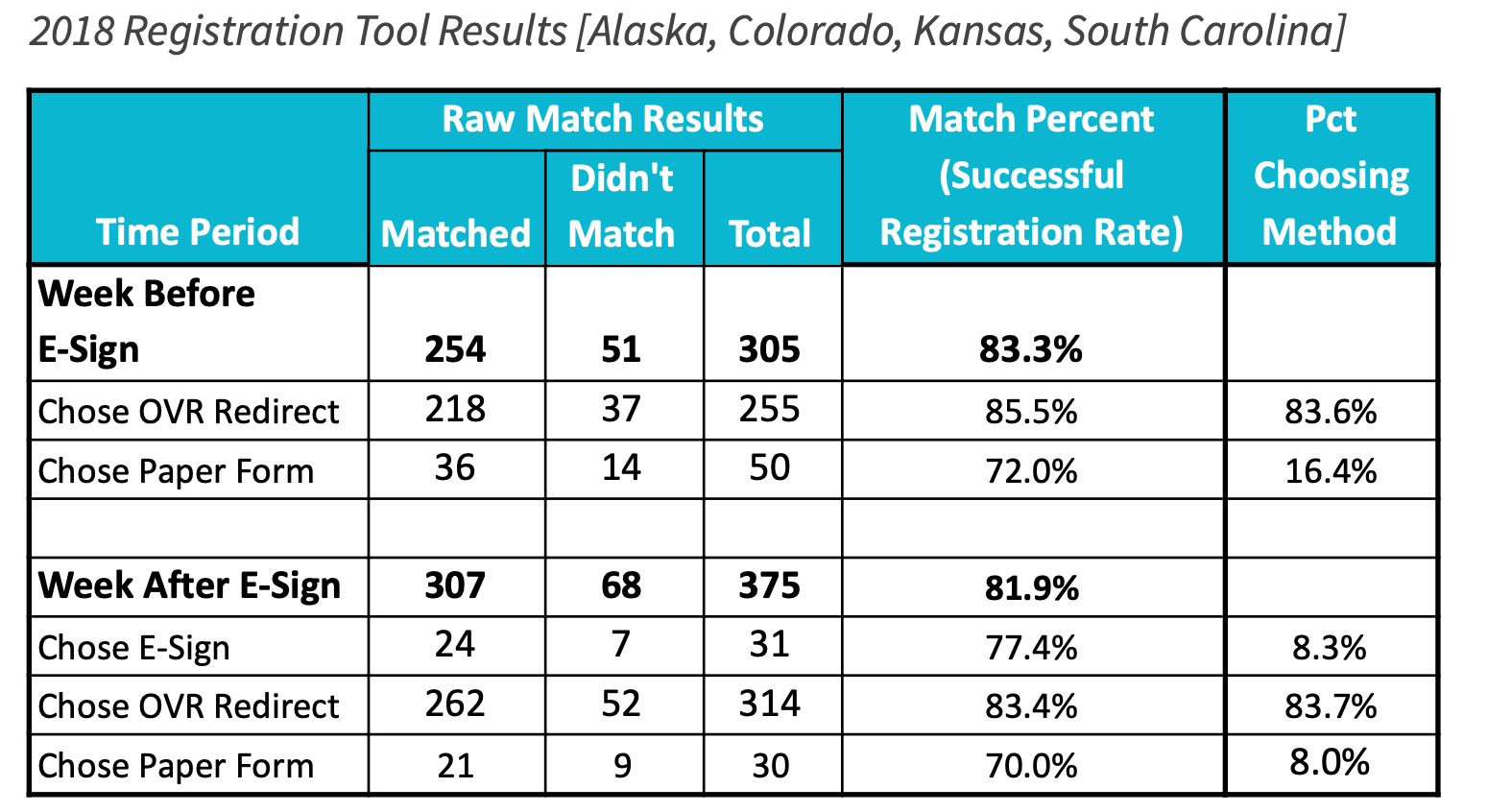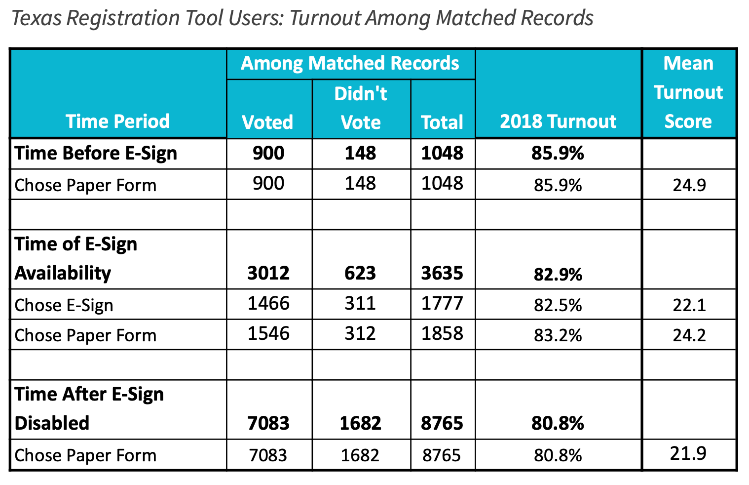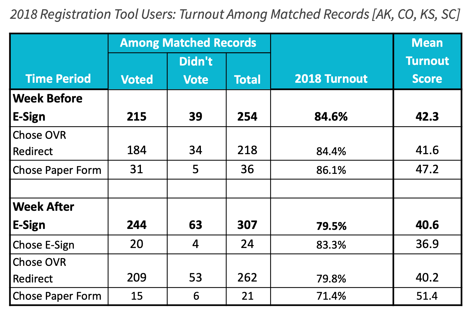 Additionally, the 2016 analysis found that overall turnout was higher among those who chose E-Sign versus those chose the printable PDF, despite the fact that E-Sign users were more likely to be young and/or infrequent voters.