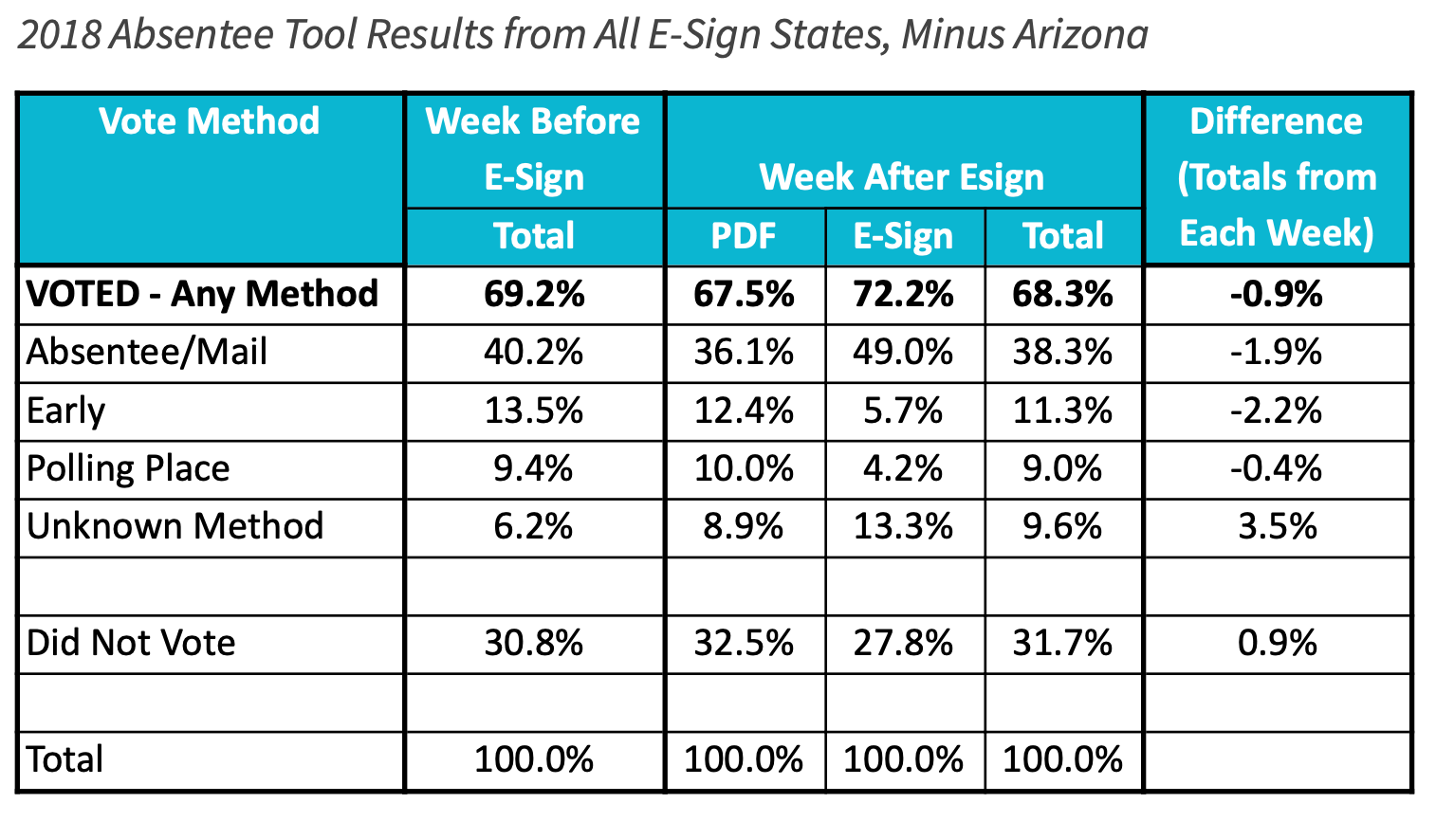 Of course, the 2016 analysis was observational in nature, and in some states the turnout rates and/or absentee voting rates were not higher during the periods when E-Sign was available. The 2016 analysis was promising, but ambiguous since self-selection could have influenced the results.