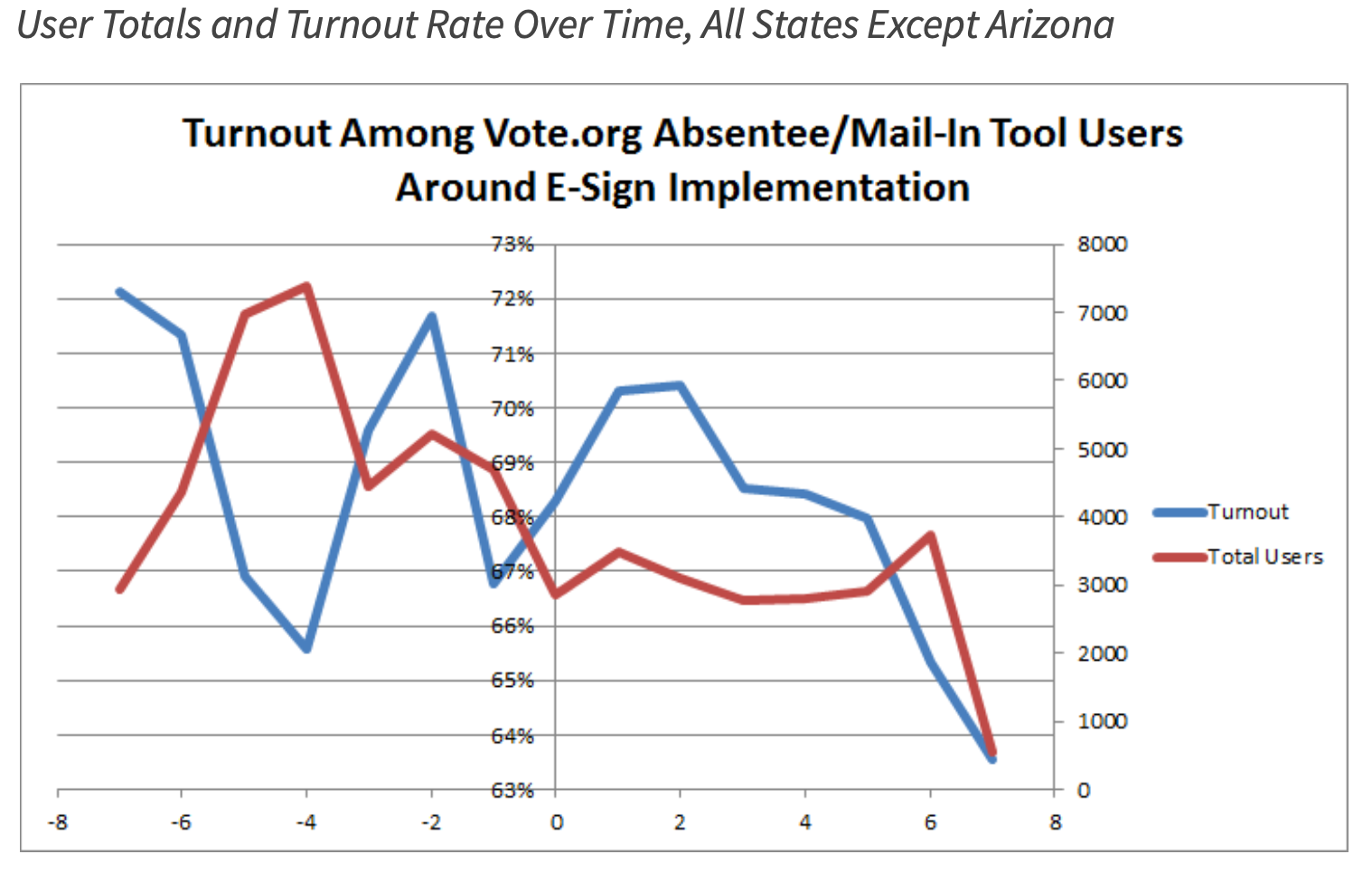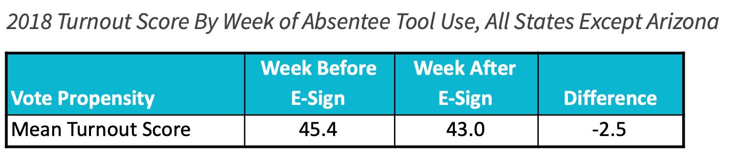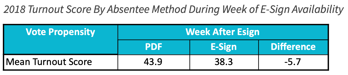 Since this difference in expected turnout is larger than the actual turnout difference, it reduces the concern that debuting the E-Sign tool may have negatively impacted turnout.