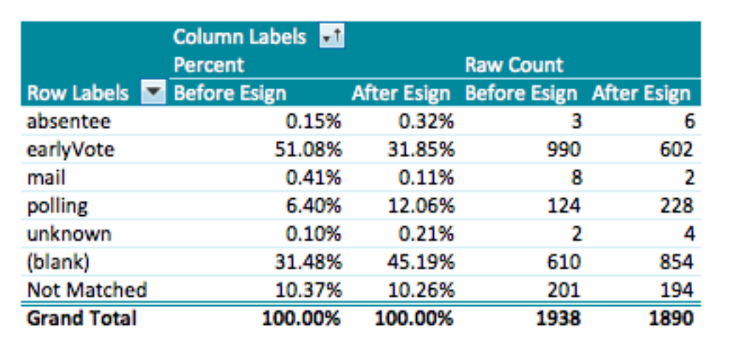It is also notable that, once again, success rates declined during the time period closest to the election. In this case, the later time frame was one in which E-Sign was not available. If there are negative linear effects on success rates as time marches toward Election Day, then E-Sign appears to have stemmed those effects.