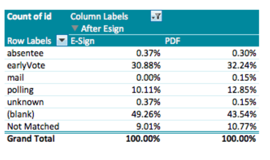 A key finding is that E-Sign users were much more likely to vote absentee than those who chose the print-your-own PDF option. Since all users ostensibly visited this particular NCO page in order to sign up for absentee status, the 13-point improvement in successful absentee voting can be considered a rousing success. In exchange, E-Signers had lower rates of early voting and Election Day voting at polling places – though higher rates of “unknown method” voting.