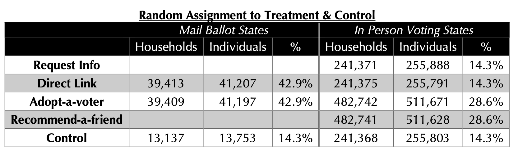 - Each treatment was expected to have a different effect on turnout in the Nov. 2018 Election.