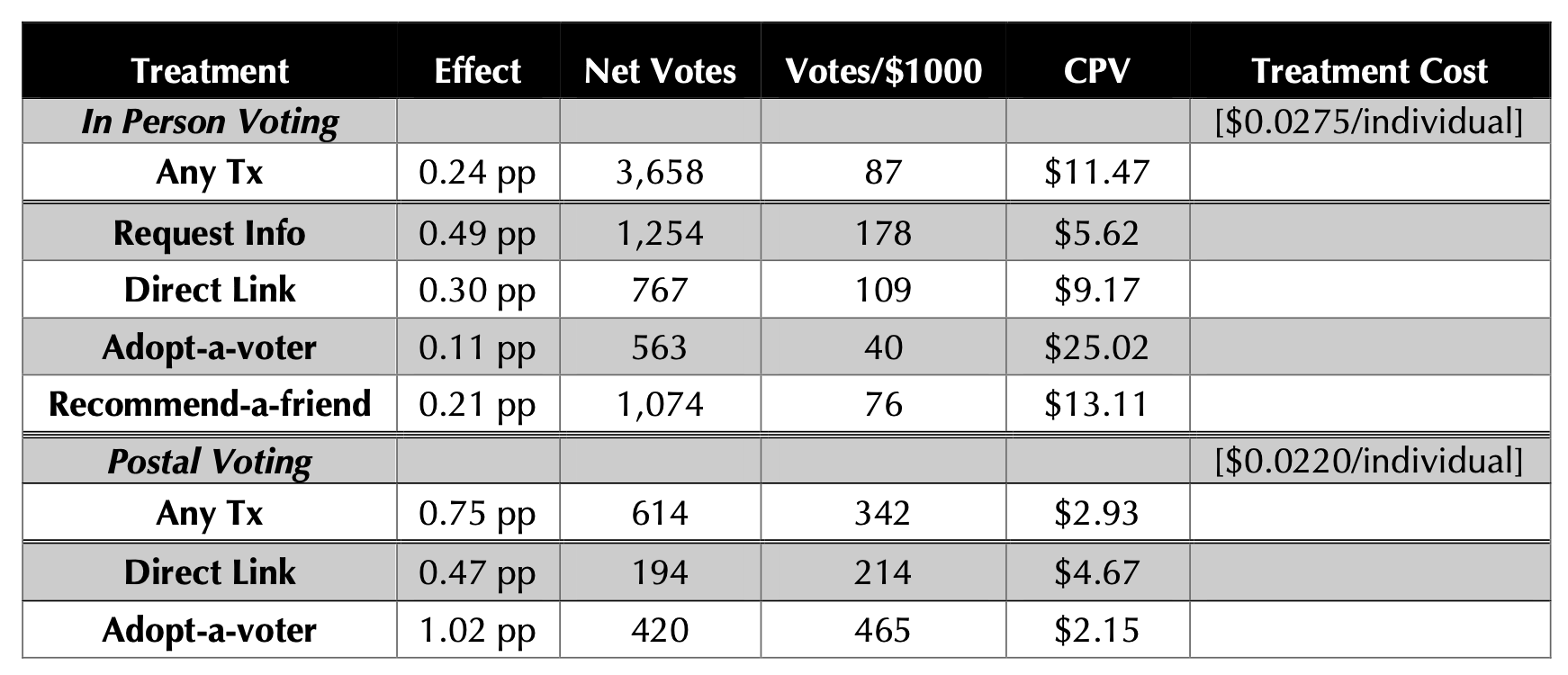 The cost per net vote (and net votes/$1000) calculation includes all costs of design, delivering, and managing the treatment delivery process.