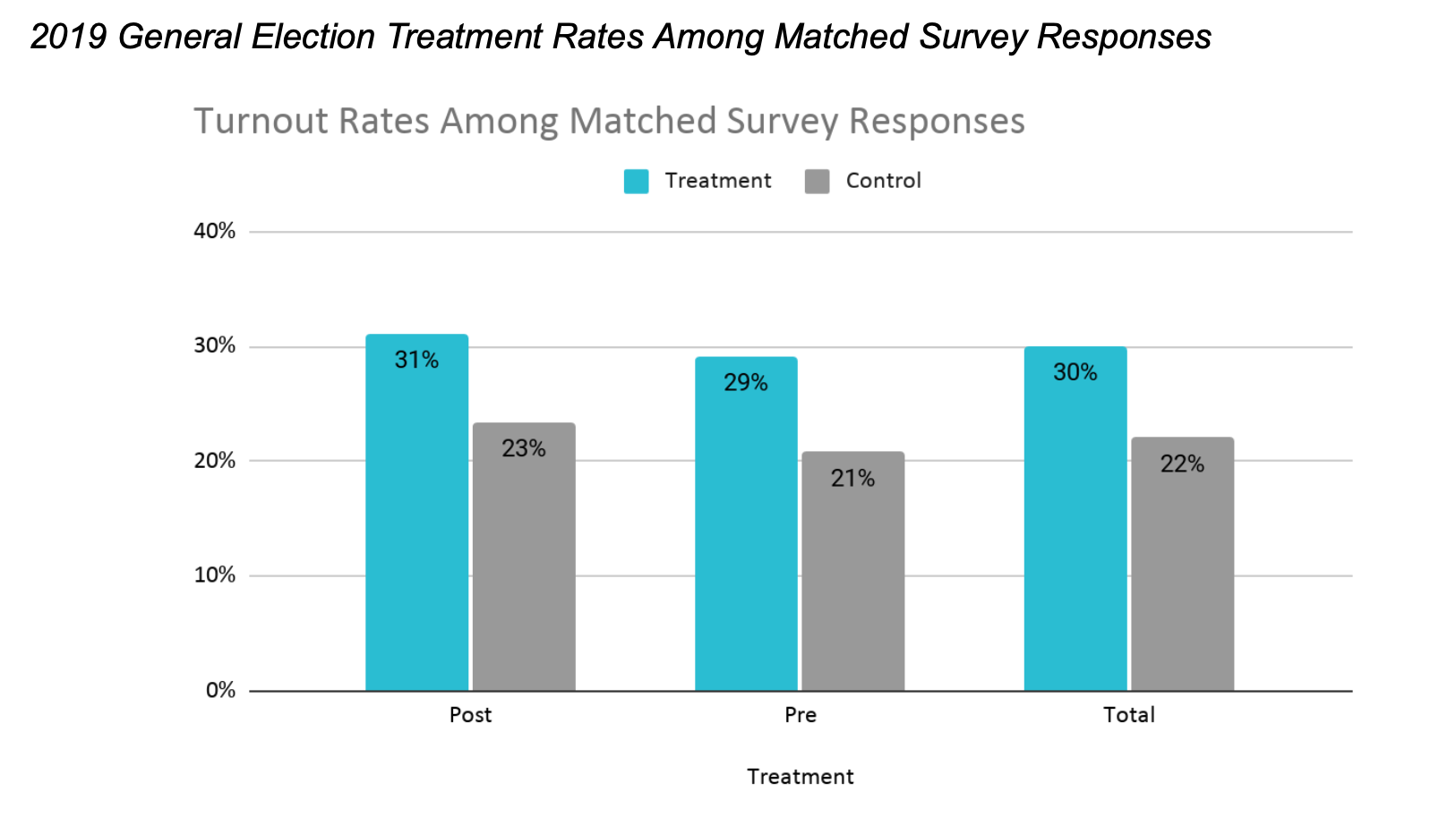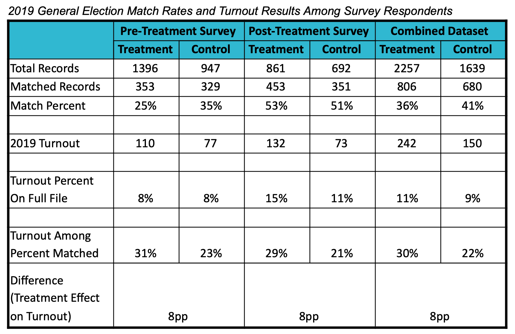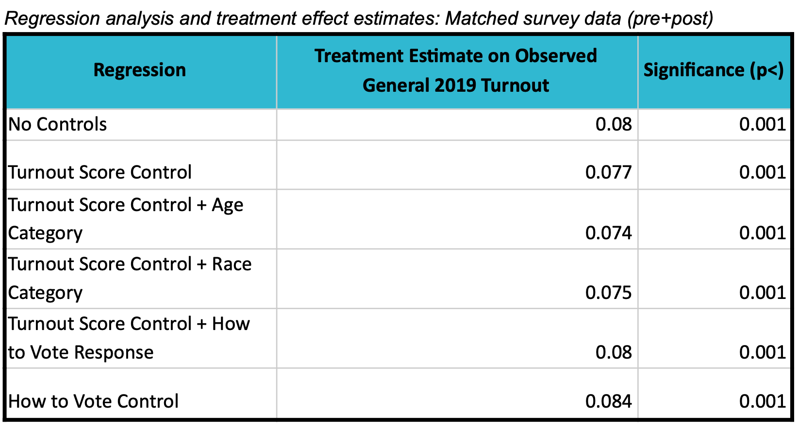 The matched survey respondents were compared across treatment and control groups, with particular attention to the difference in turnout among the matched voters. Regression analysis was then performed to ensure that other confounding factors were not unduly influencing the results.