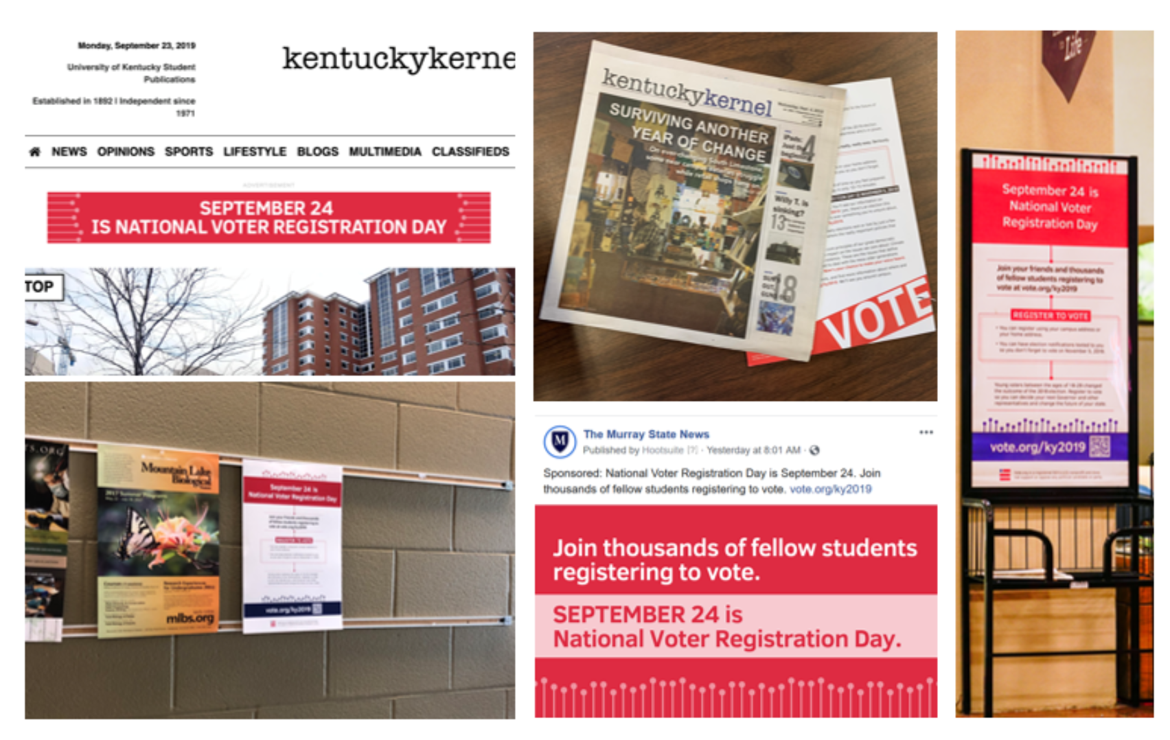 The ads appeared in a mix of media such as campus billboards, student newspapers, targeted digital, posters, flyers, and bar coasters displayed throughout the campuses (see Appendix II). The ads were also timed to events within the late election cycle such as National Voter Registration Day, the deadlines for registration, and GOTV.