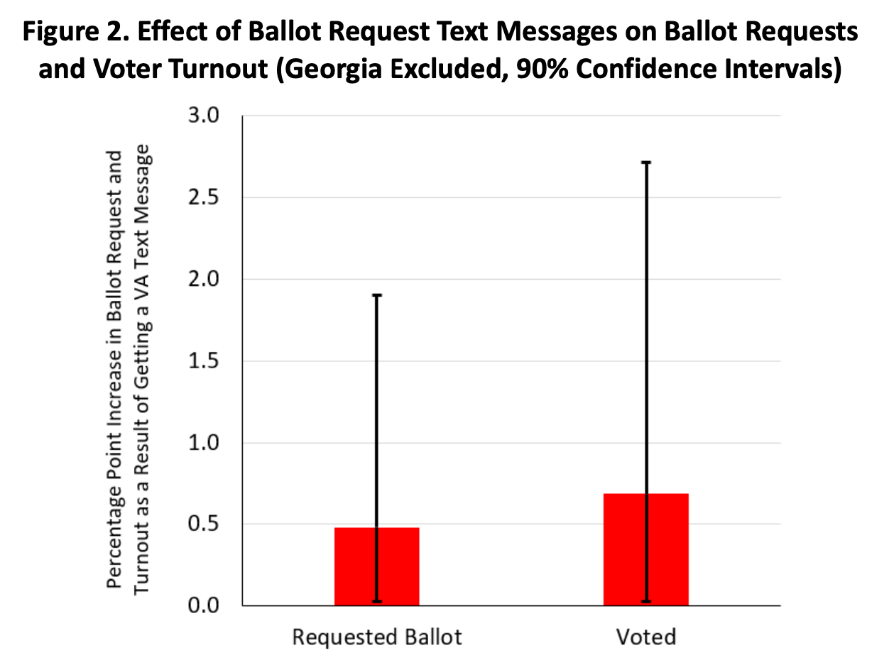 The overall constellation of results is consistent with “effect attenuation.” That is, the intense election environment and the research design that that political environment necessitated both reduced the actual effect of the messaging and VoteAmerica’s ability to accurately observe that effect. That we observe some effects consistent with expectations is a good sign that when messages are appropriately targeted and the right political environments present themselves, the text-messages can be helpful.
