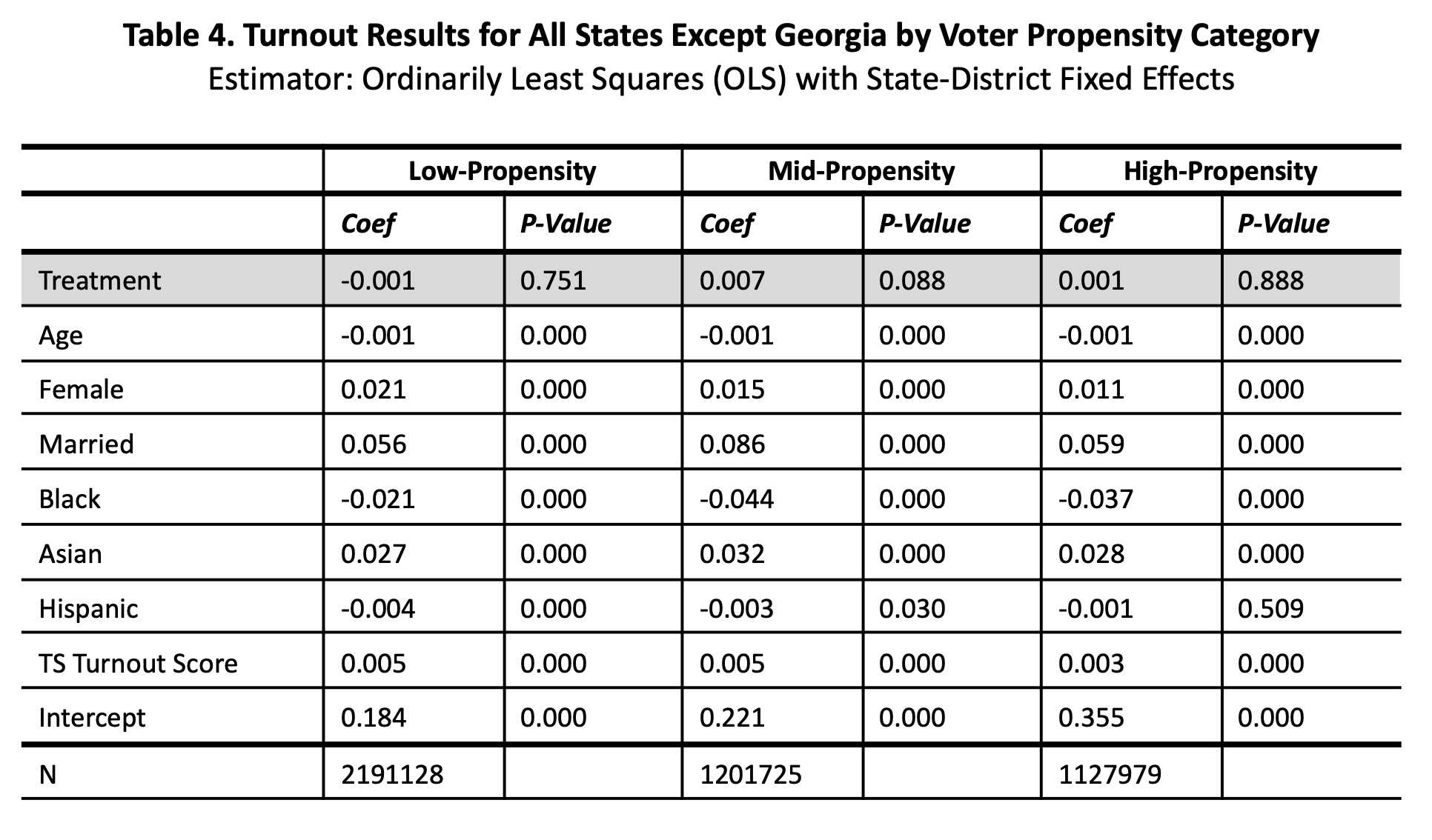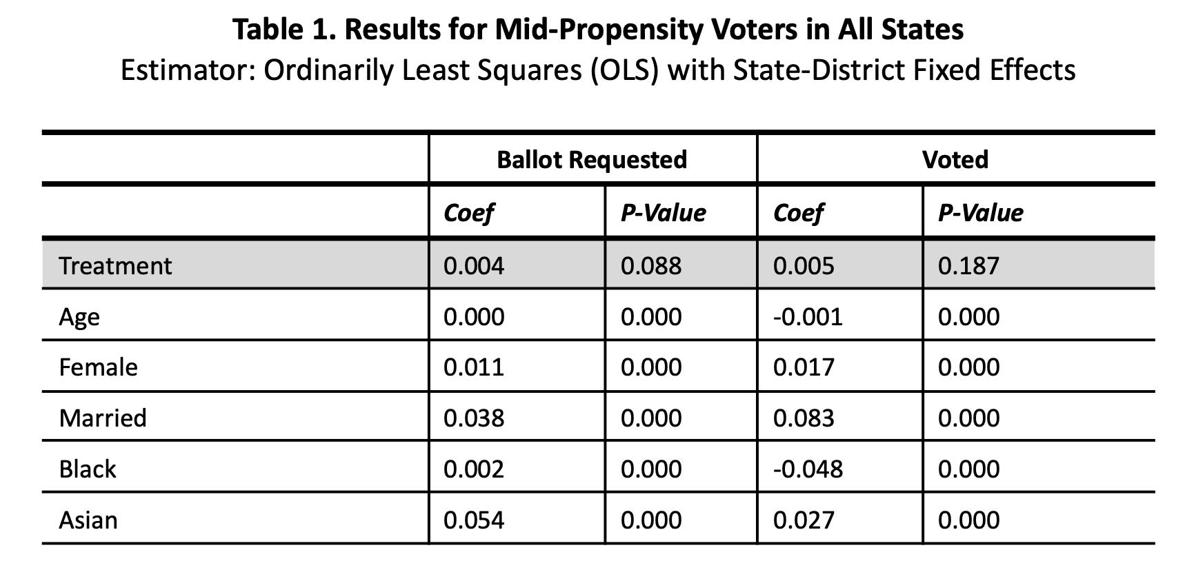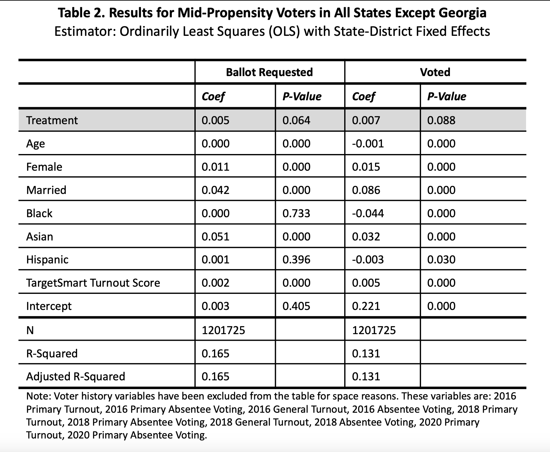 To test the effect of treatment, ordinary least squares (OLS) with state-congressional district fixed effects was used. The models include an array of control variables: age, sex, marital status, race, TargetSmart Turnout Score, and voter history (turnout and use of absentee balloting).