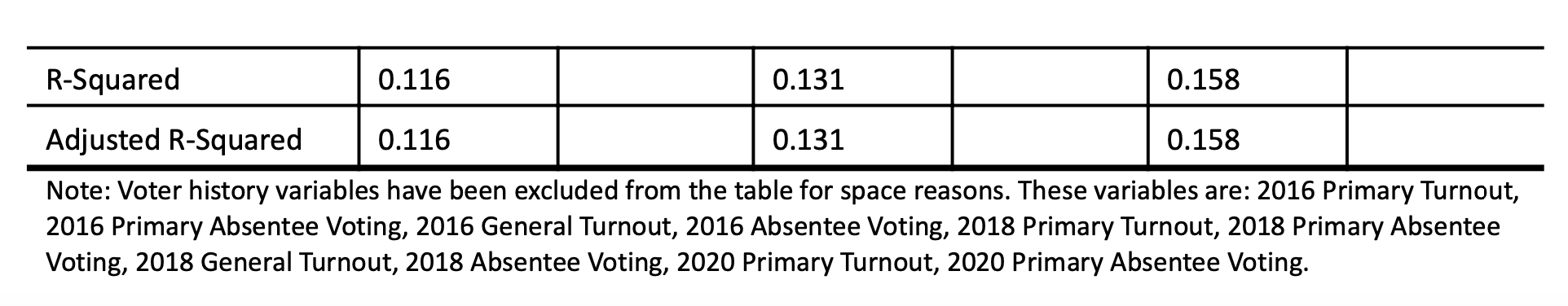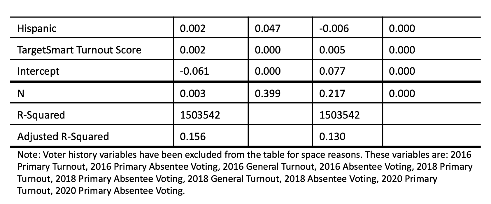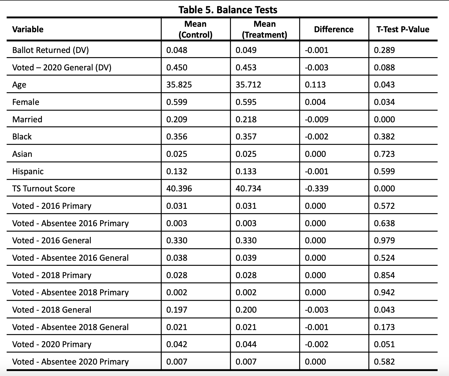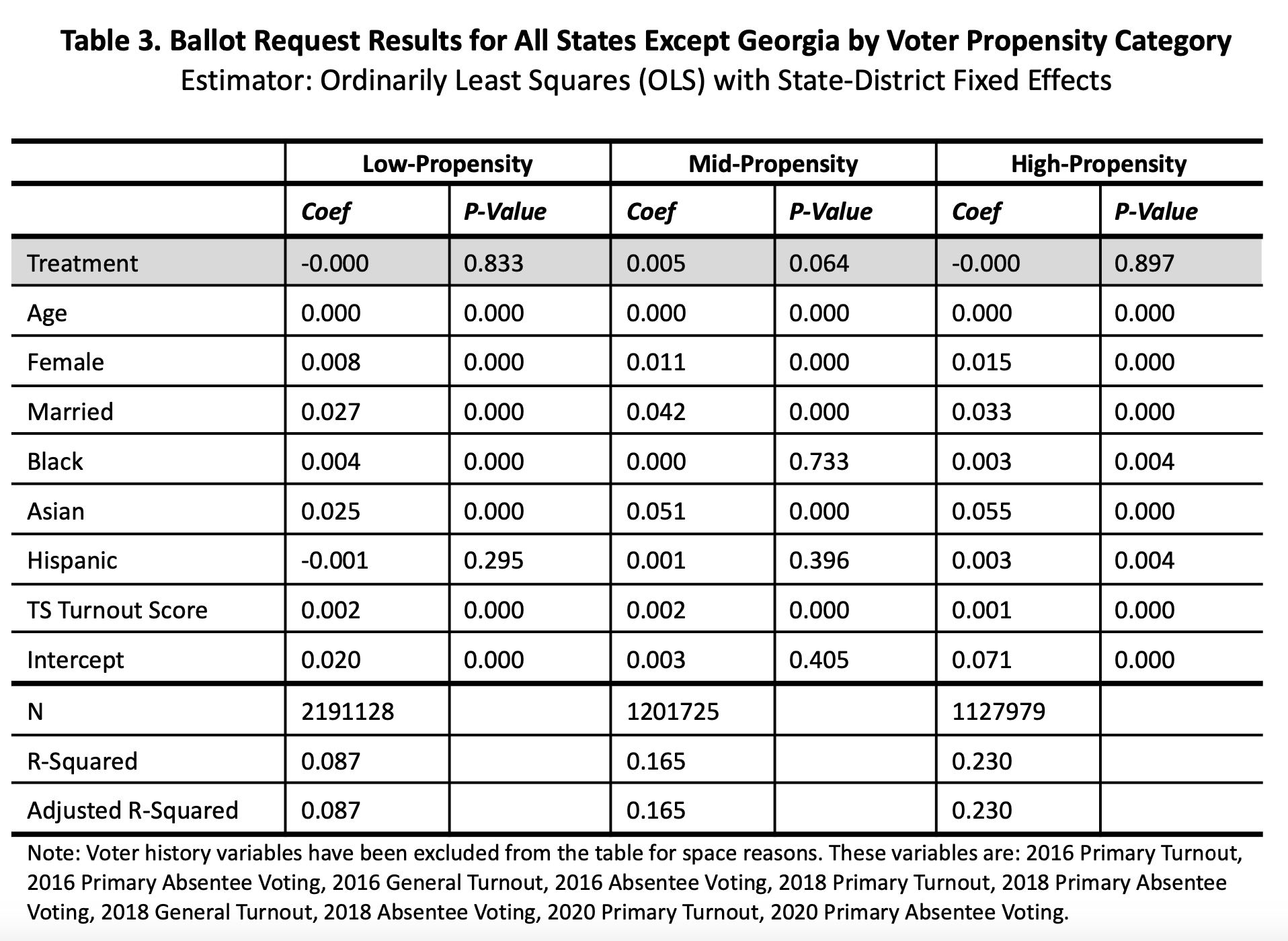 To test the effect of treatment, ordinary least squares (OLS) with state-congressional district fixed effects was used. The models include an array of control variables: age, sex, marital status, race, TargetSmart Turnout Score, and voter history (turnout and use of absentee balloting).