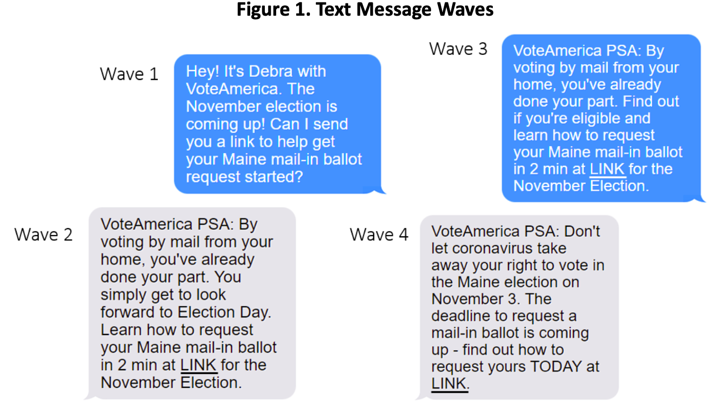 In total, VoteAmerica contacted 5,532,915 potential voters with up to four different messages. Those four text-messages are presented in Figure 1. All of these potential voters were in VoteAmerica’s target universe of historically low-turnout populations including people of color, people under 35, and unmarried women.