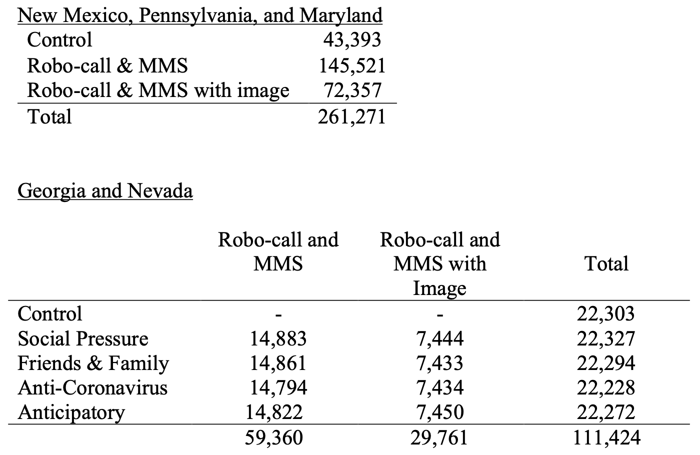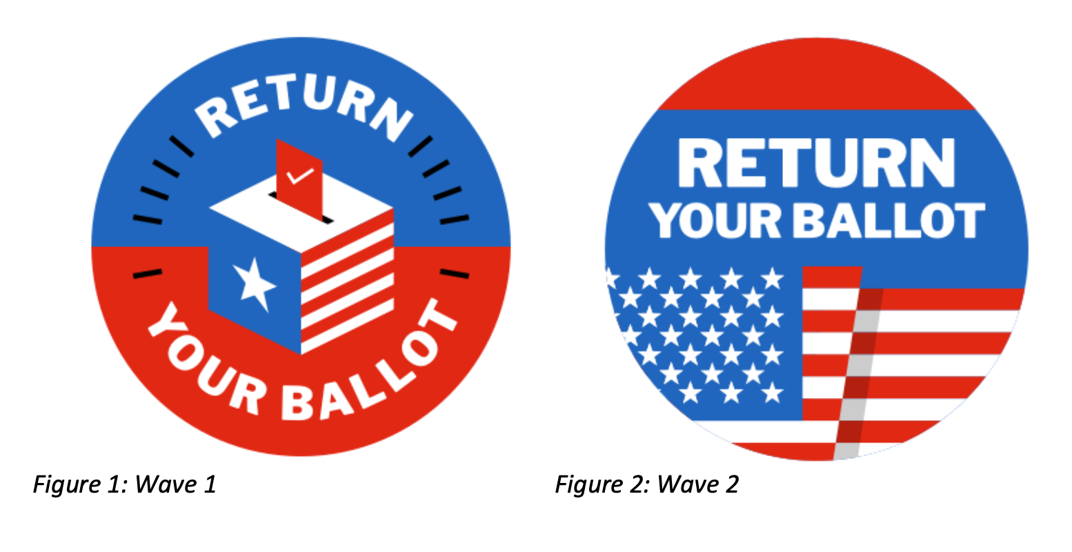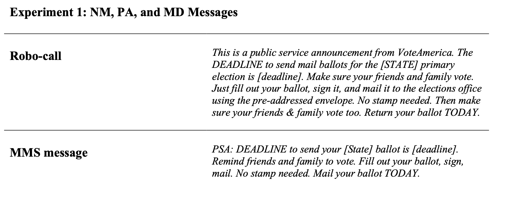 In the first experiment in Maryland, New Mexico, and Pennsylvania, targeted voters received one wave of contact encouraging them to return their mail ballots for the June 2nd primary election (time constraints for program execution prevented a second wave of contact). All targeted voters received the same message in these states.