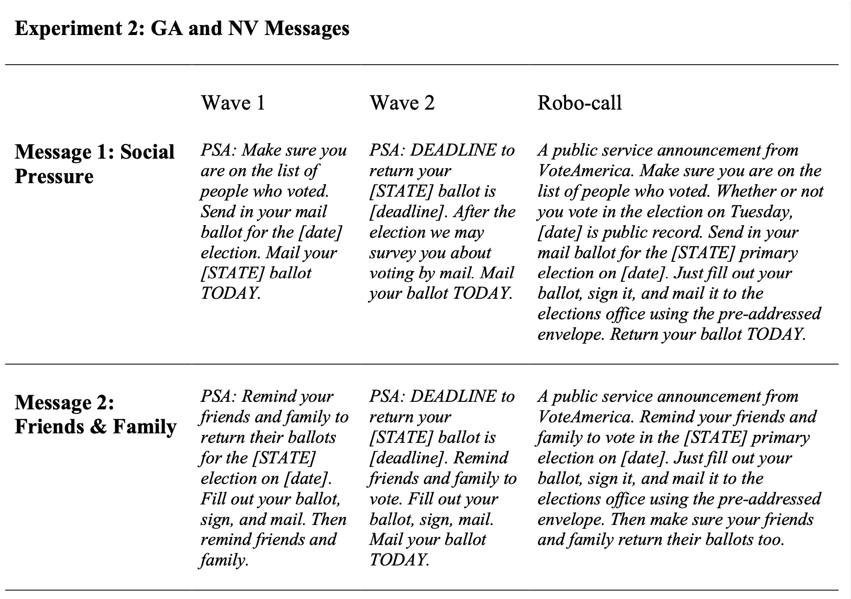In the second experiment in Georgia and Nevada, targeted voters received two waves of contact encouraging them to return their mail ballots for the June 9th primary election. Additionally, four different messages were tested in Georgia and Nevada (see Message Test section).