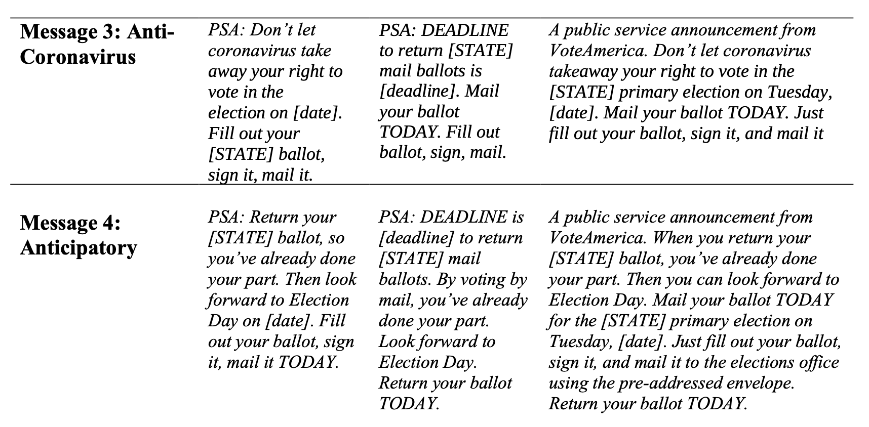 Anti-coronavirus: This treatment was developed specifically for the pandemic and successfully increased turnout in earlier ballot chase pilot tests in special elections. Motivation to return the ballot is increased by framing voting by mail as an action against the coronavirus and/or the uncertainty created by the pandemic.