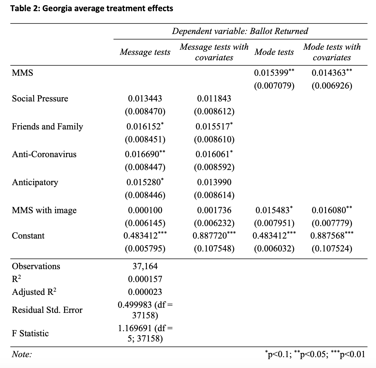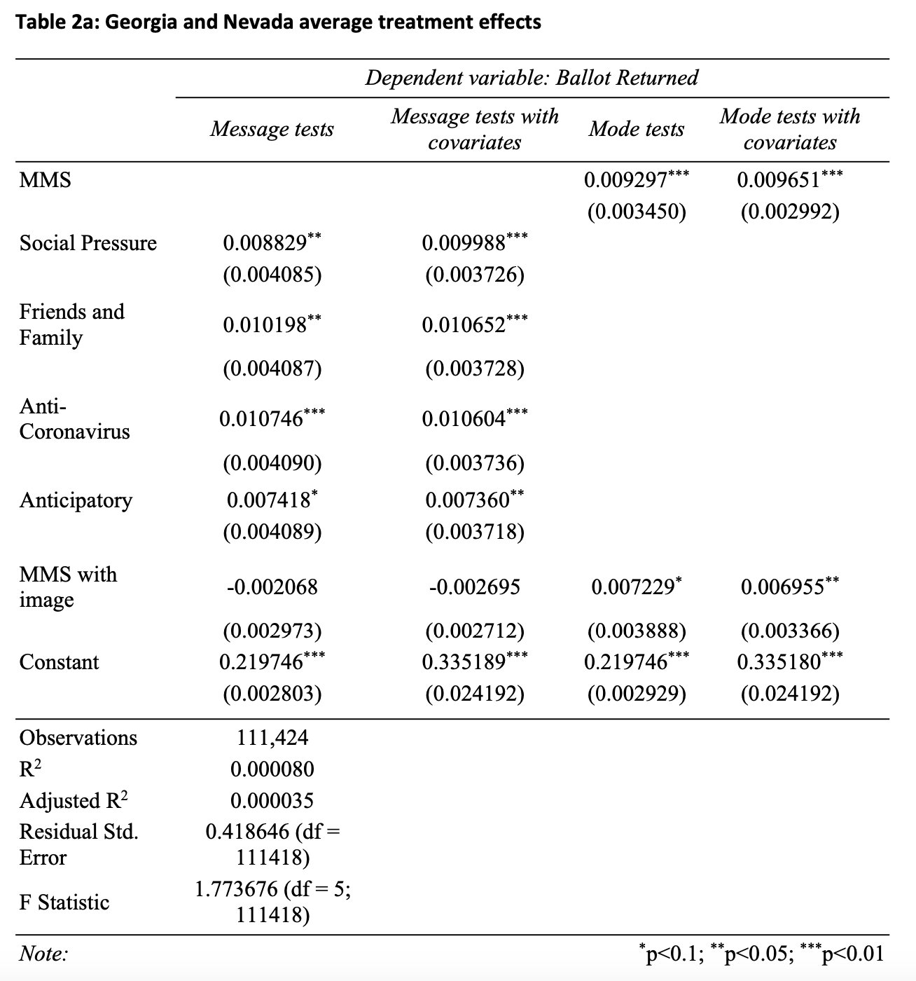 The second experiment also suggests there is little difference across the tested messages. Three messages were based on messages found to be effective in tests in previous elections, and the fourth was based on poll message testing. Therefore, the absence of statistically significant differences across these messages is unsurprising. Each message caused a statistically significant increase in ballots returned —